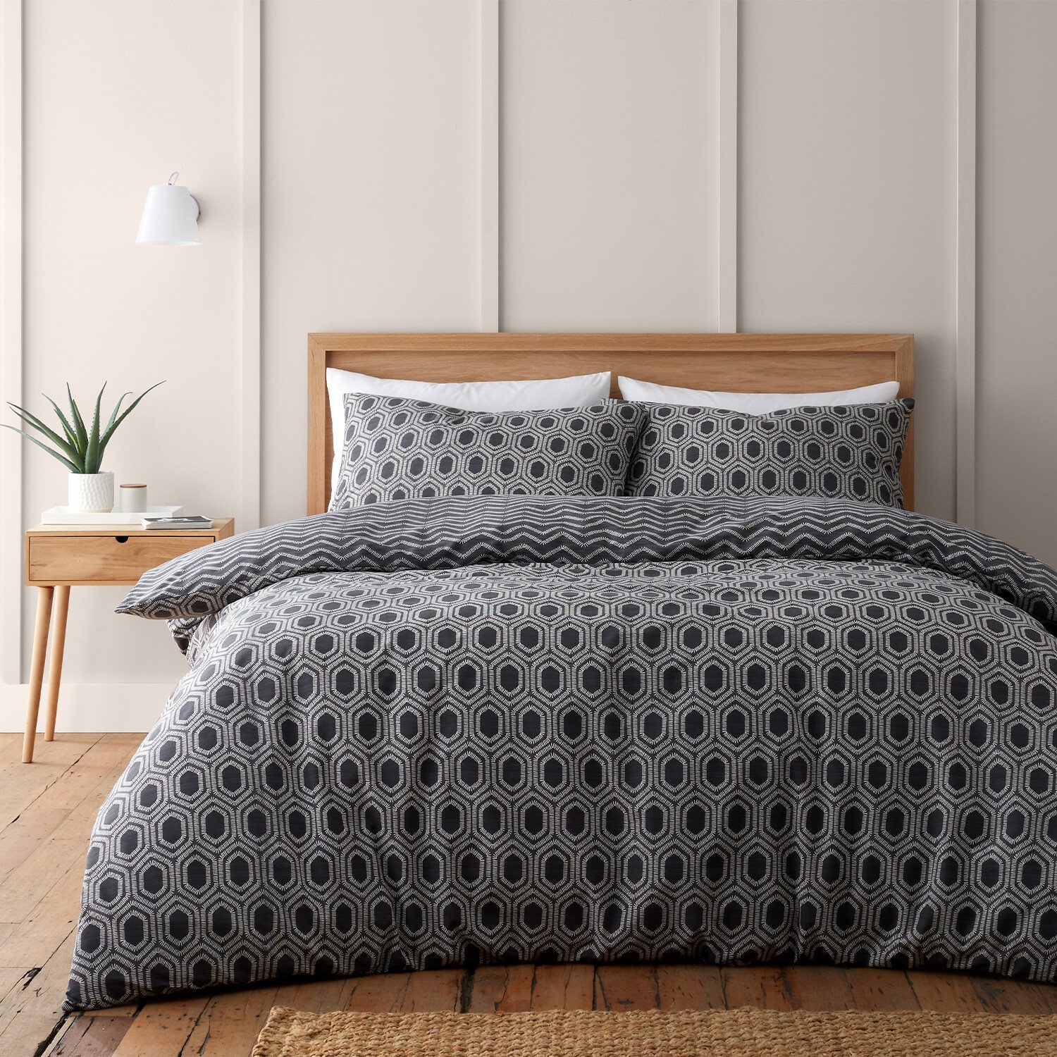 This Iona Geo Duvet Cover and Pillowcase Set combines rich deep colour with contemporary geometric design for a modern take on Art Deco. A fantastic addition to a monochrome interior, this bedding is reversible, so you can easily change up the design whenever you like. Bringing interest and style to your space, it's a great way to upgrade your bedroom.