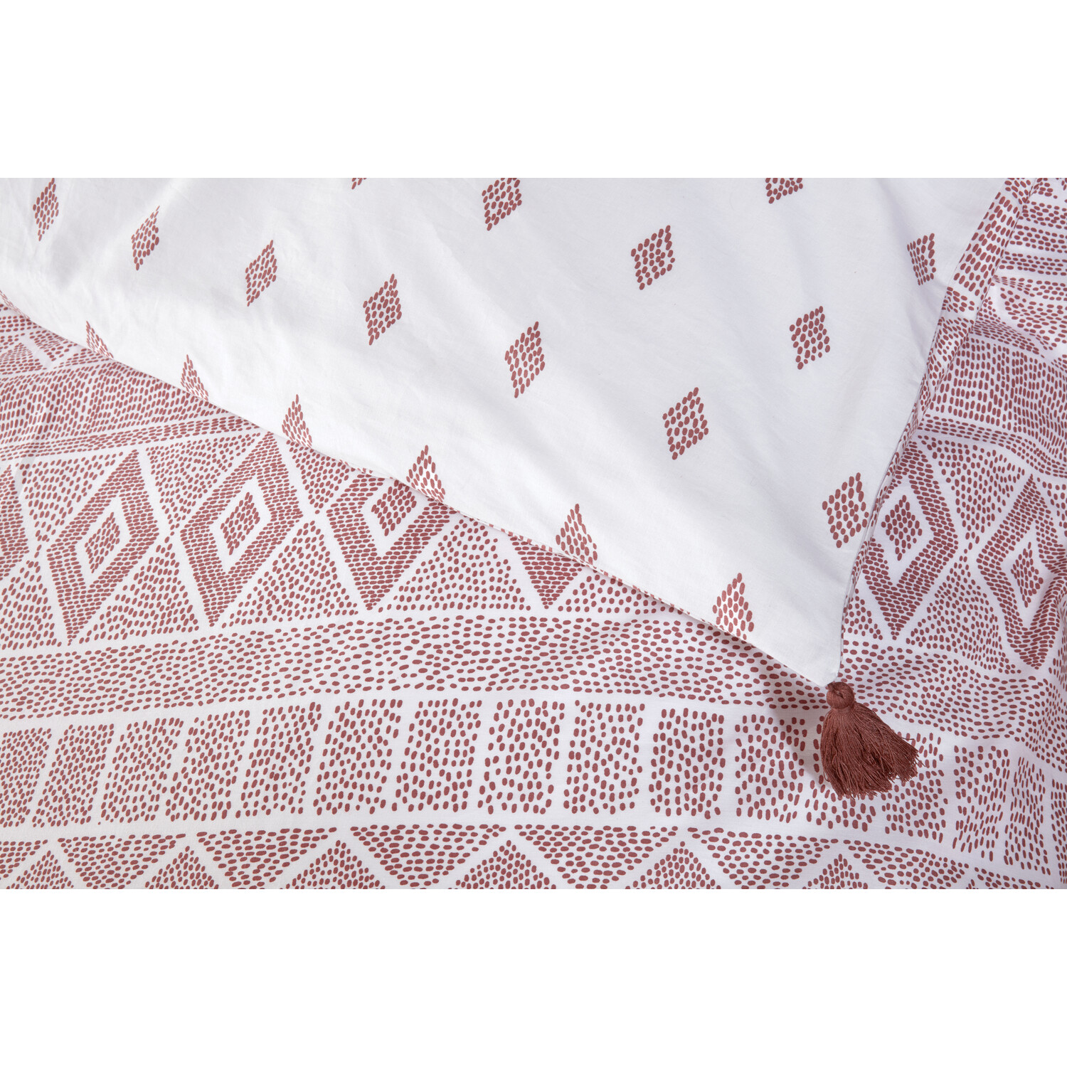 Add a gentle flair of colour to your space with this Talia Duvet Cover and Pillowcase Set. Featuring a geometric pattern inspired by Aztec design, this bedding has tasselled corners for added texture and unique styling. A great way to update your bedroom, this set is soft and comfortable with a reversible design, making it a wonderful choice for any home.