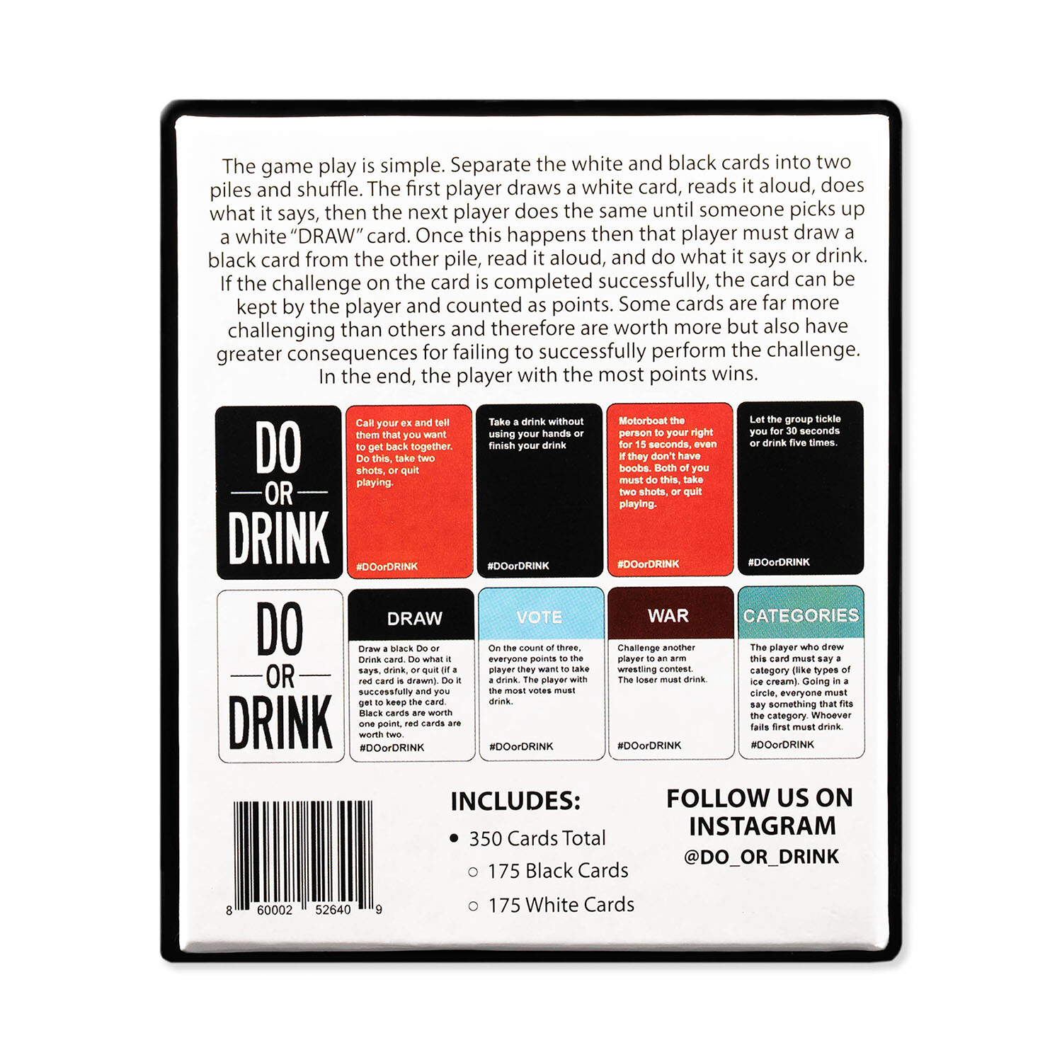 Do or Drink Win or Blackout Edition makes for an outrageous party in a box, perfect for your next party, get-together or game night. Including 350 cards with dares and fast-paced challenges, this hilarious and savage party game is super fun to play with your friends.