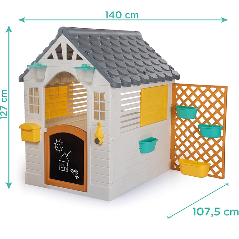 This colourful and robust Dolu Garden Playhouse with Accessories can be used indoors or outside and is easily assembled. It features an opening half door with a blackboard (chalk not included), sliding shutters on the windows to the sides and a post-box and an electronic bell, It also comes with a fence with flowerpots. Dimensions 140 x 92.5 x 127 cm. Suitable for ages three years and above.