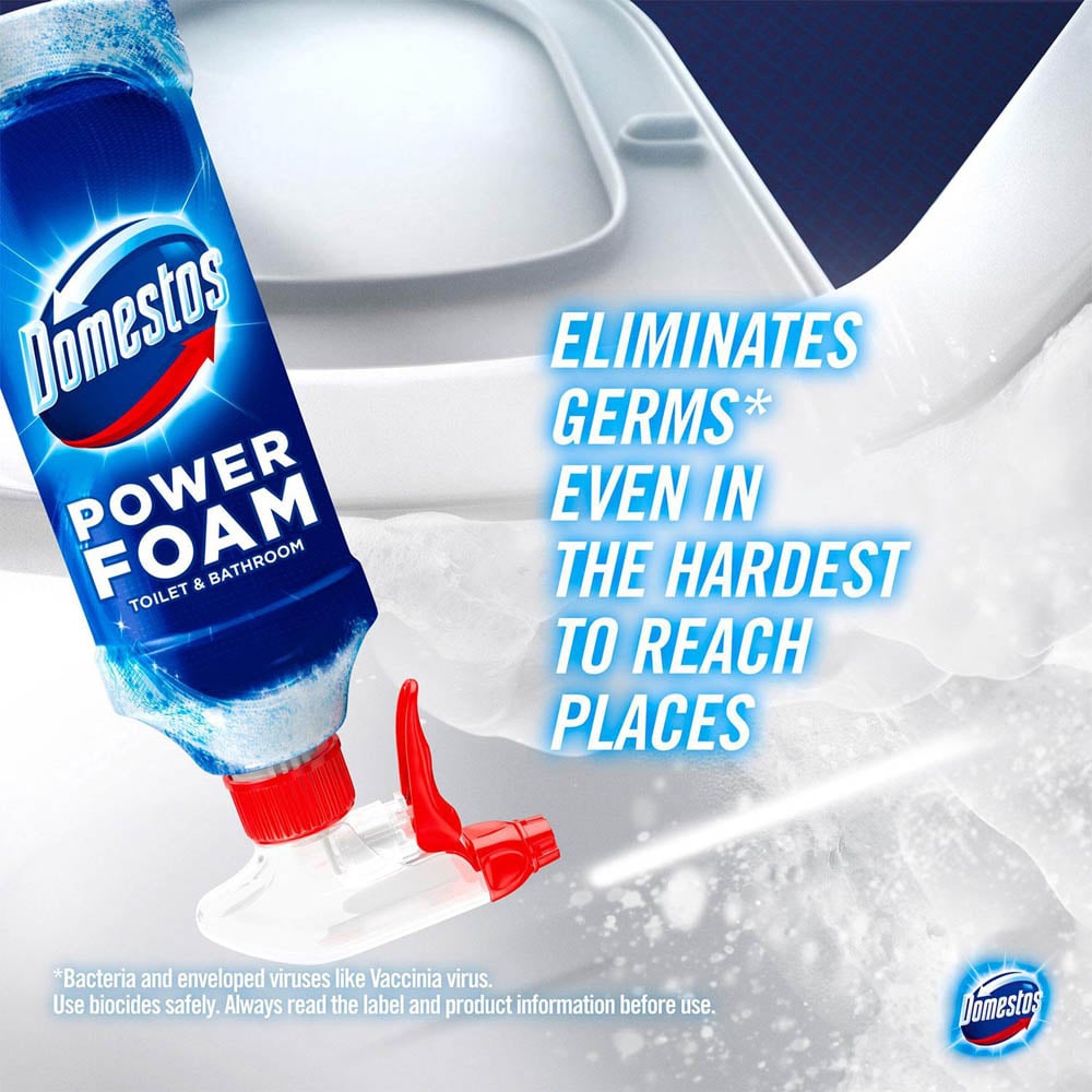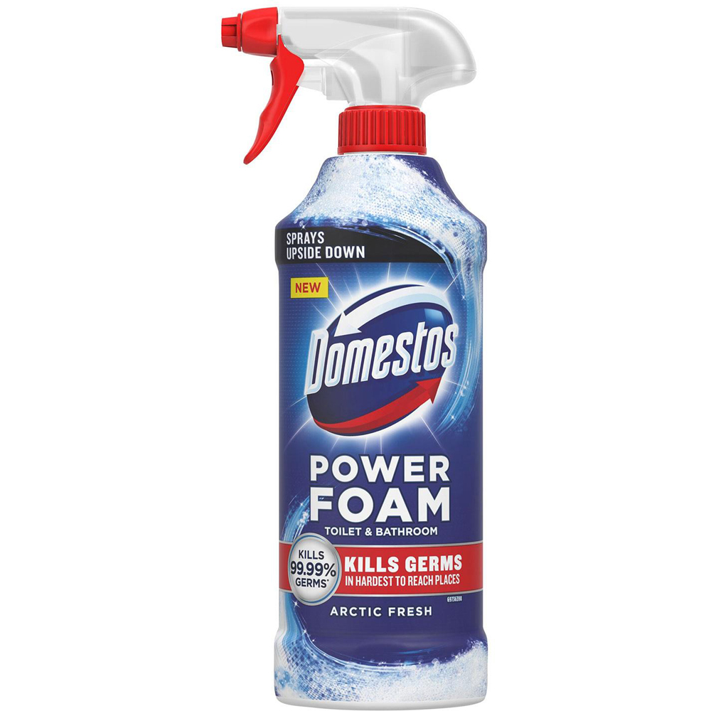Struggling to kill germs in the hardest-to-reach places around your toilet and bathroom? Specially designed to work upside down and kill 99.99% of germs, Domestos Power Foam Arctic Fresh toilet and bathroom cleaner spray features a convenient trigger head that works upside down to reach underneath the toilet rim, killing germs in the hardest-to-reach places both inside and outside the toilet. It's effective on limescale on all bathroom surfaces such as tiles, sinks, taps, mirrors and showers, removing limescale and soap sebum effectively. The power foam expands to kill germs in all areas. This toilet and bathroom cleaner leaves your surfaces free of germs with a zesty bio-degradable fragrance and features a bottle made of 50% recycled plastic. How to Use: Spray the product evenly under the rim and on the toilet bowl. Leave to work for at least 30 minutes to eliminate germs. Flush/rinse. Rinse well immediately after applying on painted wood, anodised aluminium and toilet seats. Size: 450ml. Pack: 8.