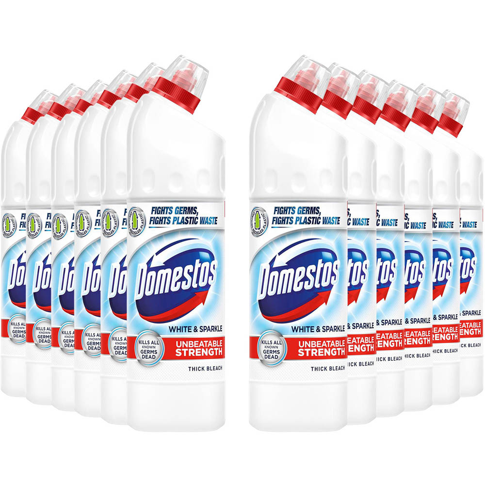 The Domestos White & Sparkle Thick Bleach eliminates all known germs. Whether it's in the bathroom or anywhere else in the home, this multipurpose cleaner will leave household surfaces disinfected to help keep your family safe. Not only does it work as a disinfectant, eliminating 99.9% of germs and viruses, but it removes stains and makes your white surfaces whiter. In the bathroom, thanks to anti-limescale active molecules that stick even below the waterline, it removes stains and helps prevent the build-up of limescale. Once diluted this Bleach is easy to use as a multipurpose cleaner for surfaces all around your home. Size: 750ml. Pack: 12.