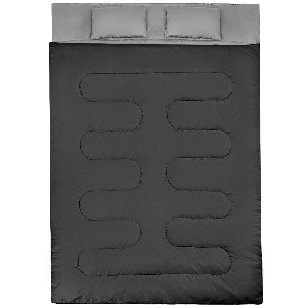 This double sleeping bag is designed to guarantee good sleep after a full day of outdoor activities. This extra-large sleeping bag, perfect for couples and families who enjoy camping and love the outdoors, is soft and comfortable. The two-tone sleeping bag is lightweight and comes with a carry bag. Moreover, it can be used as a large 2-person sleeping bag or separated into 2 singles. A must-have for anyone who enjoys the great outdoors but still enjoys the comfort of a good night's sleep. Extra-large 2-person sleeping bag. Separates into two separate sleeping bags for individual use. When joined as a double the bag has zippers on both sides. Inside phone pocket. Crafted from high-quality water-resistant 190T polyester, lined with T/R fabric and filled with luxurious cotton. Designed for near-freezing temperatures, it can keep you warm and cosy even when it's 0- 15. Waterproof, weather-resistant design and prevents you from any dampness Comes with two small T/R fabric pillows Perfect for hiking, camping, travelling and more! Included a travel-friendly carrying bag with extra holding straps which makes it quite convenient to store and carry.
