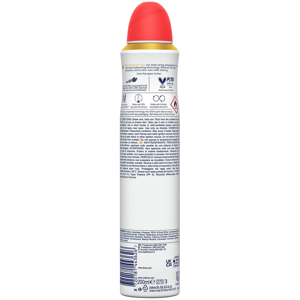 Dove Advanced Care Go Fresh Anti-Perspirant Spray Peach & White Blossom 200ml, 30 Pack Be whisked away to a sun-kissed orchard with Dove Advanced Care Go Fresh Peach & White Blossom Anti-Perspirant Deodorant Spray from our most caring anti-perspirant range. Blending the refreshing aroma of ripe, juicy peaches with the sweet and sultry undertones of delicate white blossoms, this aerosol delivers 72-hour odour and sweat protection and keeps you feeling energised and beautifully confident with a long-lasting scent. Our anti-perspirant deodorant is enhanced with revolutionary Triple Moisturising technology, featuring moisturising agents that work like water magnets to draw in moisture, as well as premium caring ingredients that deliver softer, smoother underarm skin. With the utmost care, this deodorant spray boosts your skin and helps to reduce underarm irritation caused by shaving. Features: Dove Advanced Care Go Fresh Peach & White Blossom Anti-Perspirant Deodorant Spray offers long-lasting anti-perspirant protection, underarm care and a refreshing scent An anti-perspirant deodorant providing up to 72 hours of sweat and odour protection Our anti-perspirant spray has a fruity floral scent that keeps you feeling clean, fresh and confident How to Use: Shake well, hold can 15cm from the underarm and spray. Safety Warnings: Do not use on broken skin. Stop use if rash or irritation occurs. Avoid direct inhalation. Do not spray near the eyes. Do not pierce or burn, even after use. Keep out of reach of children.
