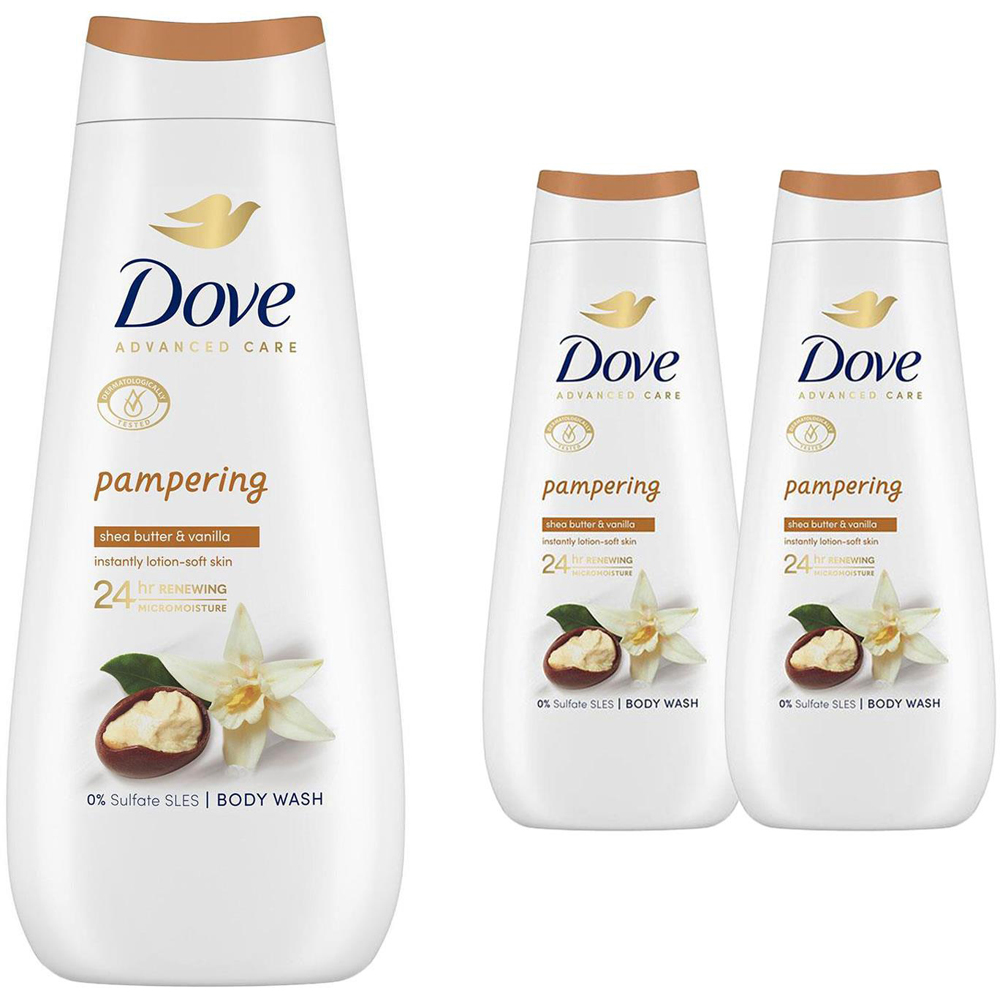 Dove Advanced Care Body Wash Pampering 24Hrs Renewing Micro moisture 400ml, 3 Pack Are you looking for an indulgent Body Wash to bring a little more self-care to your daily routine? Dove Advanced Care Pampering body wash is a rich and creamy moisturising Body Wash that works to deeply nourish as it cleanses. Unlike other shea butter products, Dove Pampering Body Wash has a moisturising formula that contains a unique blend of skin-natural nutrients to give you the Dove care you know and love. Unlike ordinary body washes, Dove Advanced Care is made with 24-hour Renewing MicroMoisture. With a cosy, irresistible fragrance of shea butter and warm vanilla scent, this moisturising body wash pampers skin with a foamy lather that will indulge your senses and moisturise skin. And it doesn't stop there - this formula uses a blend of naturally-derived mild cleansers and skin natural nourishers to gently cleanse your skin and nourish your microbiome. It's also free from Sulfate SLES, has 94% biodegradable ingredients and is packaged in 100% recycled plastic bottles. Features: 24-Hour Care, Now From Your Shower: Dove Advanced Care Pampering Body Wash gently cleanses and deeply moisturizes the skin, leaving it replenished and lotion-soft for 24 hours. Feel Lotion-Soft All Day: This nourishing formula is made with 24hrs Renewing MicroMoisture that leaves your skin replenished and lotion-soft all day. Shower Your Skin And Delight Your Senses: Made with shea butter and vanilla scent, this formula pampers and softens skin in just one shower. How to Use: Squeeze a generous amount of this Dove Advanced Care Pampering body wash into your palms. Spread all over your body and work into a lather. Then allow the luscious shea butter and warm vanilla scent to fill your shower. Rinse away with warm water, to reveal transformed, touchable soft skin. Box Contains: 3x Dove Advanced Care Body Wash Pampering, 400ml.