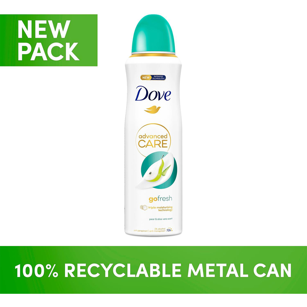 Dove Advanced Care Go Fresh Antiperspirant Deodorant Pear & Aloe Vera Scent 200ml, 12 Pack Caring for your underarms is an important part of any skincare routine. With Dove Advanced Care Go Fresh Pear & Aloe Vera Scent Anti-perspirant Deodorant Spray, you can give your skin the care it deserves, while feeling fresh with 72-hour protection from odour and sweat. Featuring a fragrance combination of juicy pear entwined with soothing aloe vera, it's the perfect aerosol to accompany you as you go about your day. Features: Dove Advanced Care Go Fresh Pear & Aloe Vera Scent Anti-perspirant Deodorant Spray features an alcohol-free, kind-to-skin formula This Go Fresh deodorant gives up to 72 hours of protection against sweat and odour This aerosol features Triple Moisturising technology that retains moisture deep within your skin Featuring Dove's most advanced formulation, this anti-perspirant deodorant delivers Dove's kindest-to-skin formula ever. Infused with the scent of juicy pear and soothing aloe vera, this deodorant helps you kick-start your day with confidence Globally, Dove deodorant is not tested on animals, with our products being certified as cruelty-free and PETA-approved vegan. How to use: To experience the freshness of the pear and aloe vera fragrance, hold this anti-perspirant deodorant approximately 15 cm away from your skin and spray for one to two seconds on each underarm.