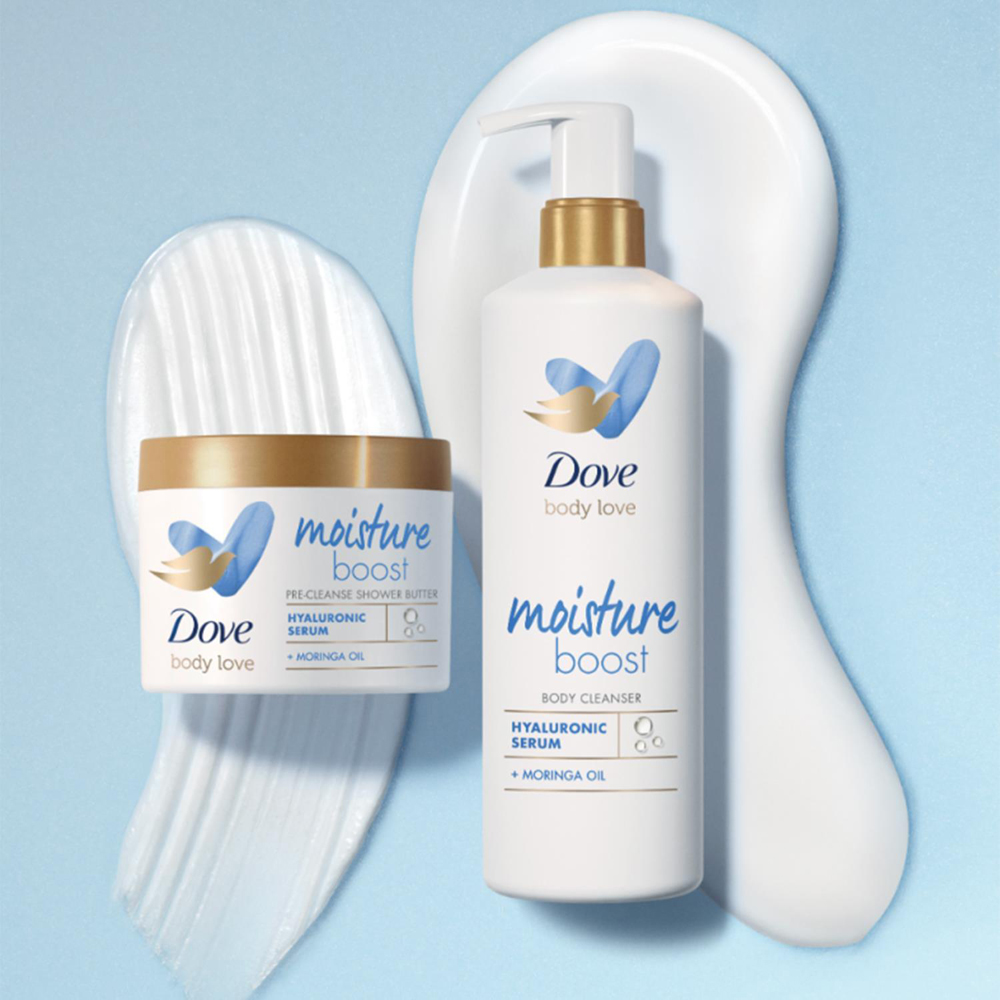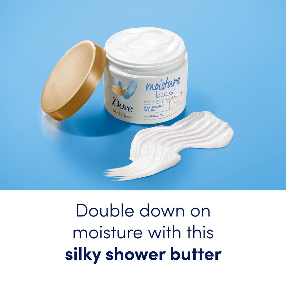 What better way to give your body some love and attention? Double down on moisture with Dove Body Love Moisture Boost Pre Cleanse Shower Butter. This deeply moisturising cleansing butter is enriched with face care ingredients, helping to boost your skin's moisture and leave you with lasting softness. This nourishing butter is the first step to more beautifully nourished skin. The rich and silky pre-cleanser deposits a blend of moisturising ingredients, boosting the skin's natural moisturization process. Follow with the Body Love serum-infused body cleanser for a second dose of moisture, locking in the skin-boosting nutrients and strengthening the skin's moisture barrier. Double down on moisture with the silky shower butter before following with the body cleanser for an extra dose of hydration. This deeply moisturising cleanser with hyaluronic acid and moringa oil drenches skin in a surge of ultra-moisture and rejuvenates the skin's moisture retention. It's a specially formulated pre-cleanser for dry skin and dehydrated skin in need of a little extra love. It's enriched with Moisture Boost Complex, with a dewy, floral fragrance with notes of white sage, vanilla and bamboo to cue sheer freshness. This moisturising cleansing butter is a naturally derived, gentle skin cleanser, is sulfate and paraben-free, formulated to be as gentle as water and is PETA-certified cruelty-free. How to use: Ever tried a pre-cleanse shower butter before? Simply apply to wet skin in the shower, and massage all over your body. The rich, buttery texture melts into a silky lather to boost your skin's moisture. When you're ready, rinse off.