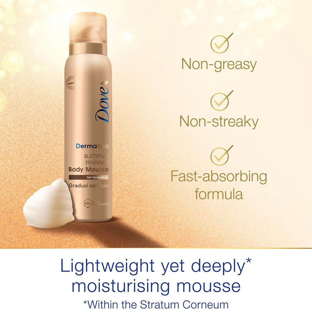 Dove Mousse glides onto your skin without leaving any greasy residue or transferring onto your clothes, allowing you to get dressed right away. The rich moisturisers in Dove products provide beautifully nourished, natural-looking bronzed skin. Say hello to year-round summer skin with the gradual tan specifically designed for fair skin, offering the perfect sun-kissed glow. With a non-greasy formula and up to 48 hours of active moisturisation, Dove Derma Spa Summer Revived Gradual Self-Tan Body Mousse is the ideal self-tanner for fair skin. This streak-free formula creates an even tan without staining your clothes, so you can wear whatever you want and feel confident all day long. It contains gentle self-tanners that build colour day by day, making it perfect for your legs, arms, and body. It is suitable for fair to medium skin tones and has a refreshing fragrance reminiscent of sun-ripened fruits. How to Use: Simply massage the lightweight body mousse onto clean, dry skin. For the best results, exfoliate your skin before use. Build your tan day by day until you achieve your desired shade, and then space out applications to maintain a natural look. Always remember to wash your hands after use and to apply a separate sunscreen product if you plan to spend time in the sun.