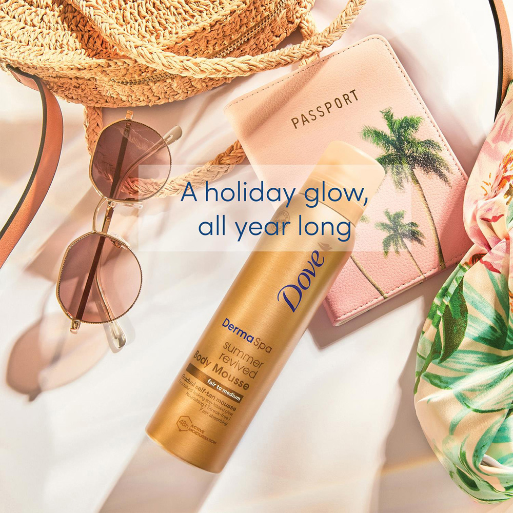 Dove Mousse glides onto your skin without leaving any greasy residue or transferring onto your clothes, allowing you to get dressed right away. The rich moisturisers in Dove products provide beautifully nourished, natural-looking bronzed skin. Say hello to year-round summer skin with the gradual tan specifically designed for fair skin, offering the perfect sun-kissed glow. With a non-greasy formula and up to 48 hours of active moisturisation, Dove Derma Spa Summer Revived Gradual Self-Tan Body Mousse is the ideal self-tanner for fair skin. This streak-free formula creates an even tan without staining your clothes, so you can wear whatever you want and feel confident all day long. It contains gentle self-tanners that build colour day by day, making it perfect for your legs, arms, and body. It is suitable for fair to medium skin tones and has a refreshing fragrance reminiscent of sun-ripened fruits. How to Use: Simply massage the lightweight body mousse onto clean, dry skin. For the best results, exfoliate your skin before use. Build your tan day by day until you achieve your desired shade, and then space out applications to maintain a natural look. Always remember to wash your hands after use and to apply a separate sunscreen product if you plan to spend time in the sun.