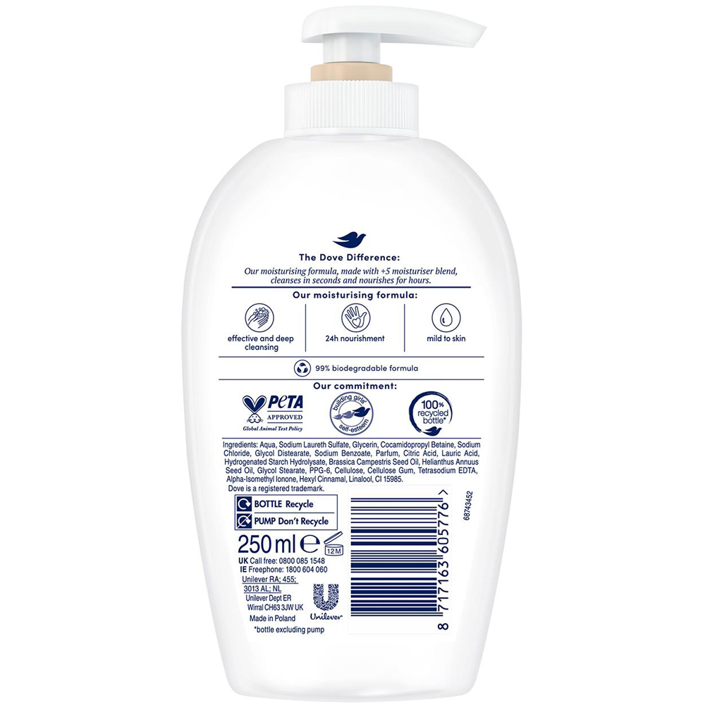 This Dove hand wash cleanses your hands with a special formulation enriched with moisturising cream to leave you with soft, smooth skin. The soft, moisturising formula helps retain hydration in your skin, making the Dove Nourishing Hand Wash suitable for everyday handwashing. Dove Beauty Cream Hand Wash gives you silky, smooth hands after each wash. This moisturising liquid hand wash, with a kind-to-skin formula, cares for dry skin. It has an elegant blue orchid scent that adds a touch of indulgence. The Dove hand wash is enriched with ¼ moisturising cream that helps to nourish hands during cleansing. Transform your daily handwashing routine into an act of beauty with the moisturising liquid hand soap. The caring formula of Dove Beauty Cream Hand Wash is suitable for everyday use and effectively cleanses your hands. How to use: Pump into your hand and work into a creamy lather, then rinse off with clean water after a gentle massage. Safety Warning: If the product gets in your eyes, rinse them with warm water. Avoid eyes and other sensitive areas.