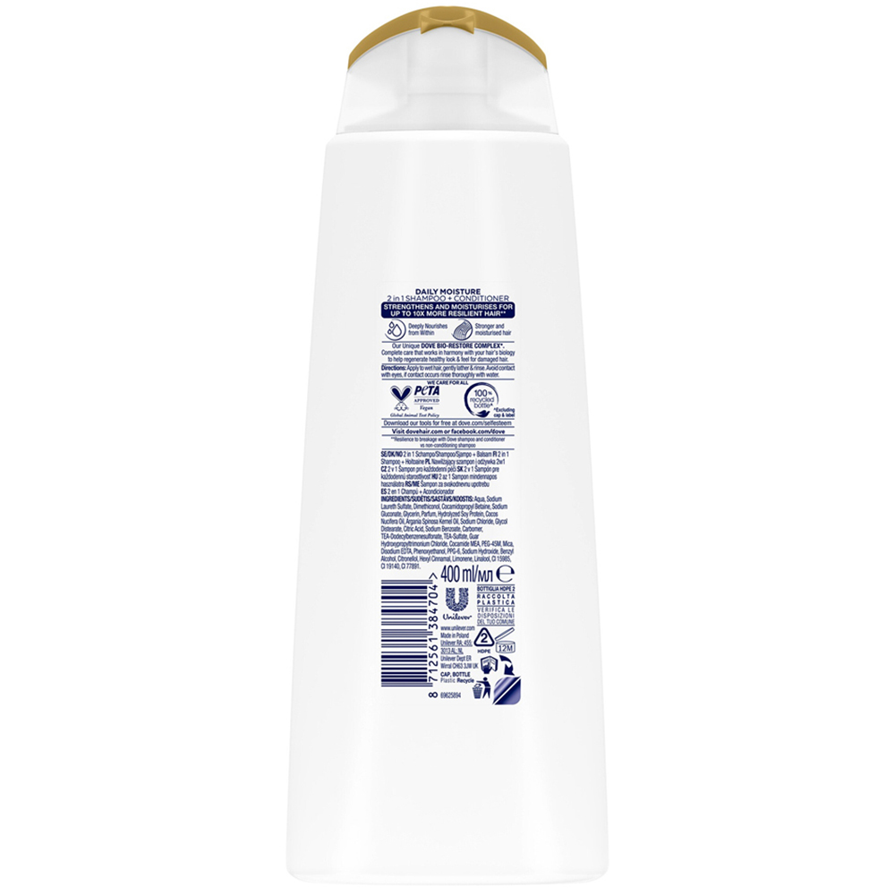 Dove Nutritive Solutions Daily Moisture 2-in-1 Shampoo and Conditioner provides the look of soft, silky hair that is easy to manage. Its unique formula is designed to enhance and maintain the beauty of your hair. With regular use, you will notice that your hair feels healthier after every wash, as it is progressively nourished. How to use: Apply Dove Daily Moisture Shampoo and Conditioner as you would with a regular shampoo. Simply lather it in your hair and rinse thoroughly. There is no need for an additional conditioner, as this product helps protect and detangle your hair on its own. After drying, enjoy softer hair that is easy to manage and style. This product is suitable for everyday use. Safety Warning: Use only as directed. Avoid contact with the eyes. If contact occurs, rinse immediately with warm water. If irritation develops, discontinue use.
