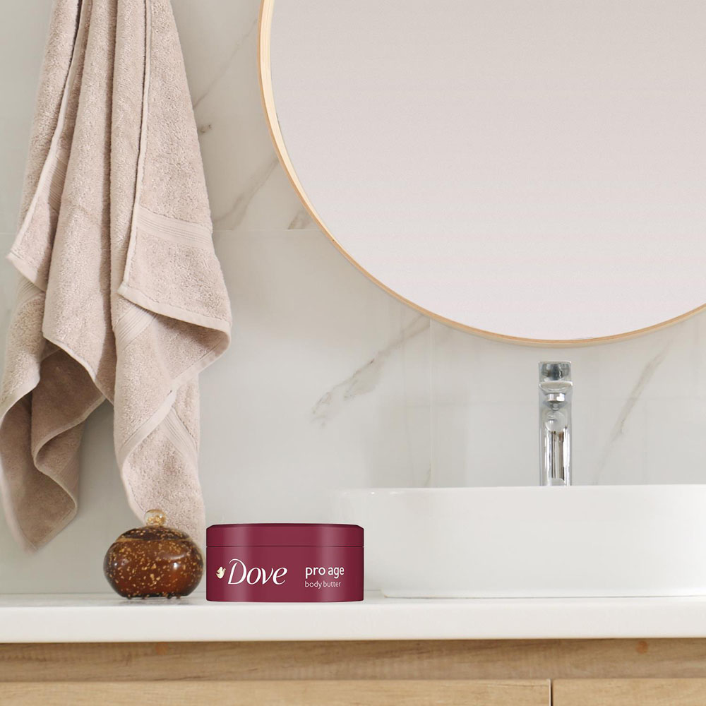 Dove Nourishing Body Care Pro Age Body Butter is a moisturising cream that combines rich ingredients and olive oil in a creamy formula to give you supple, smooth skin. This body butter deeply nourishes your skin without leaving a greasy feel. It ensures your skin remains beautifully supple and smooth all day long, embodying the belief that beauty has no age limit. Enriched with Nutri Duo, Dove's unique dual-action moisturising complex, this formula combines natural skin nutrients and essential oils to nourish the deeper layers of your skin while preventing moisture loss from the surface. The body cream provides intense moisture for up to 24 hours and contains olive oil and vitamin B3 to promote natural skin rejuvenation. Dove Body Butter can improve the appearance of dark spots, accelerate cell renewal, and help prevent dry skin. It revitalises mature skin, allowing it to restore itself naturally. This moisturiser nourishes ageing skin and reduces the visibility of dark spots. How to Use: Apply Dove Pro Age Body Butter in the morning and/or at night, or whenever your skin feels dry. Massage it gently into your skin. For the best results, use it immediately after showering. Safety Warning: Avoid contact with eyes. If eye contact occurs, wash out immediately with warm water. If irritation develops, discontinue use.