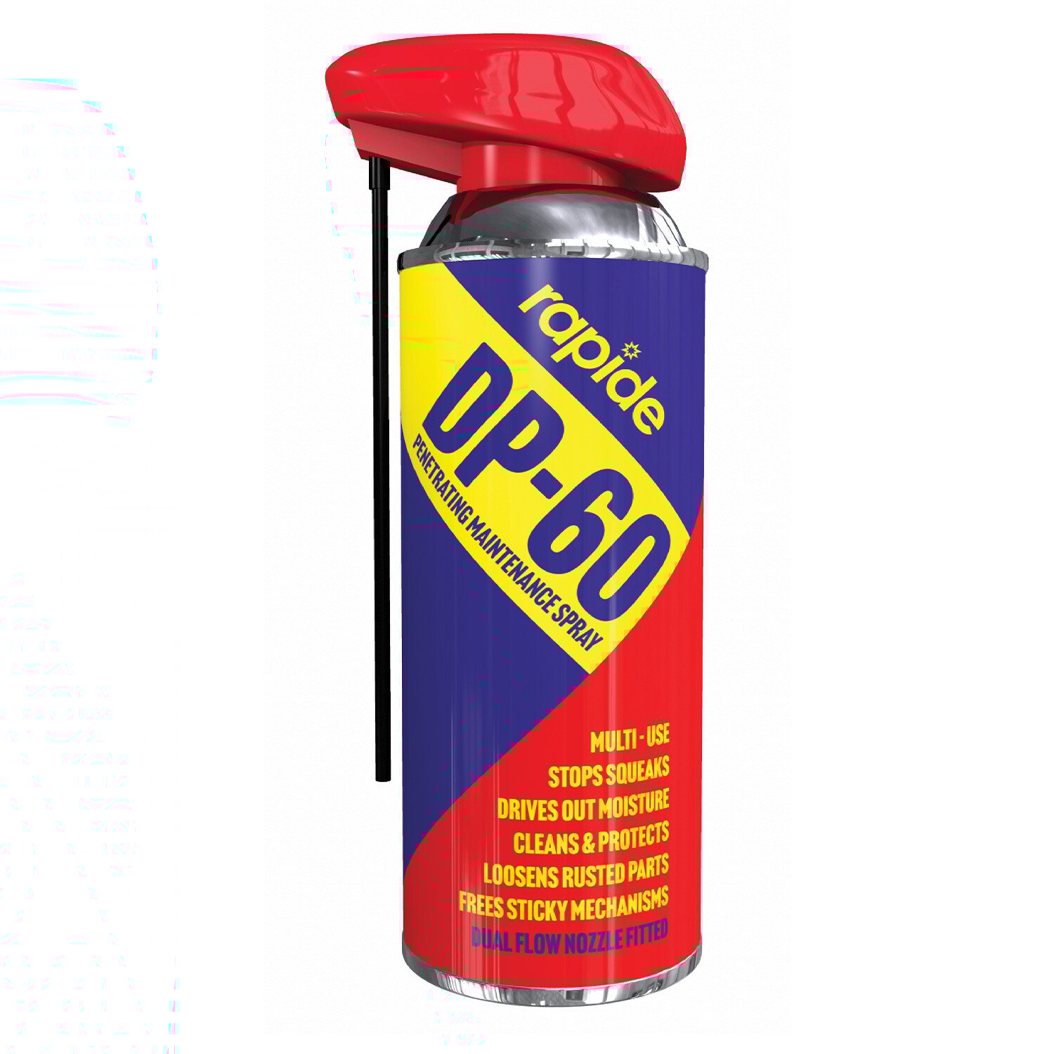 DP 60 Lubricating Spray Dual Nozzle from Rapide is a deeply penetrating maintenance spray. Designed to help protect against corrosion and rust on metal and chrome it fully penetrates, loosens and lubricates. This easy-to-use spray displaces moisture from metal surfaces, and electrical and moving parts, as well as helps to uplift grease, gum, adhesives, tar and more.