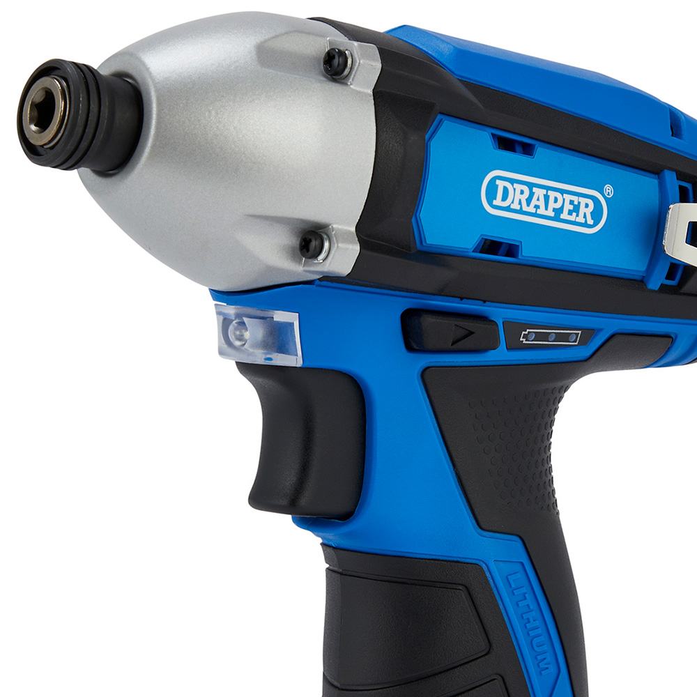 Go for the perfect power tools to help you get the job done with the Draper 12V 1/4 inch Cordless Impact Driver. Whether you're a professional contractor or a DIY enthusiast, this tool is designed to make your work easier, faster, and more efficient than ever before. With features like easy-to-use controls, powerful motors, and durable construction, it is built to withstand even the toughest job sites. Part of the 12V interchangeable multi-tool battery system, this compact 12V cordless impact driver features a 1/4-inch hex., quick-release collet, variable speed with an electronic brake and forward or reverse. It is fitted with an LED worklight and has a battery level indicator. There is also a handy belt clip, and it is supplied inside a blow moulded storage case. The Draper 12V interchangeable battery system allows you to combine one battery with any of the tools within the 12V series. So why wait? Shop today and experience the power of this tool for yourself. Batteries and chargers are sold separately.
