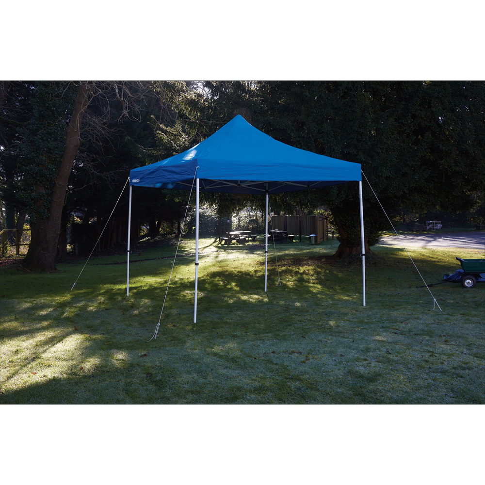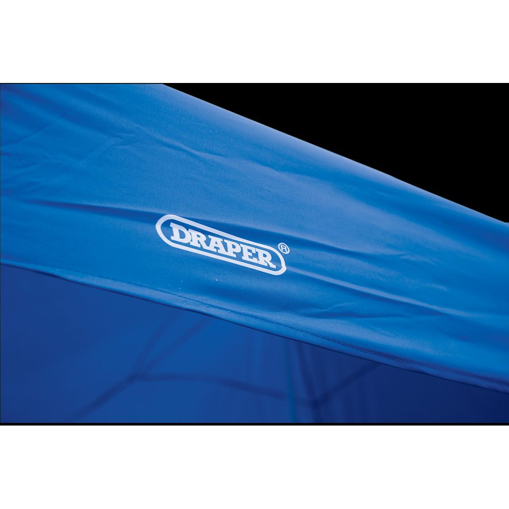 Make a versatile addition to your garden with this Draper 3 x 3m Blue Steel Foldable Gazebo. This foldable, heavy-duty gazebo is made from durable, splash-proof material with steel legs and frames for added strength. It comes with guy ropes and floor pegs for stability and has a height to the centre of 3 meters. Perfect for use in the garden or for outdoor DIY projects. The gazebo is conveniently packed in a storage bag for easy portability and is sold loose. Note: Do not use it in extreme weather conditions.