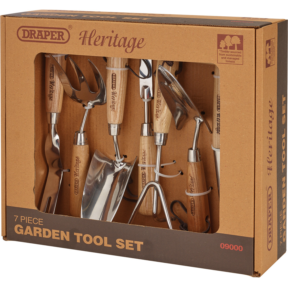 Immerse yourself in gardening with the Draper 7 Piece Stainless Steel Garden Tool Set. This collection of essential tools is crafted from strong, polished stainless steel with solid ash handles. They are accented by a touch of luxury with soft leather hanging straps. The tools are built to last and are backed by a lifetime warranty. They are also made using sustainably sourced materials. The set includes: 1 x Transplanting trowel, 1 x Hand trowel, 1 x Weeding fork, 1 x Hand weeder, 1 x Hand cultivator, 1 x Hand patio weeder, 1 x Hand dibber.