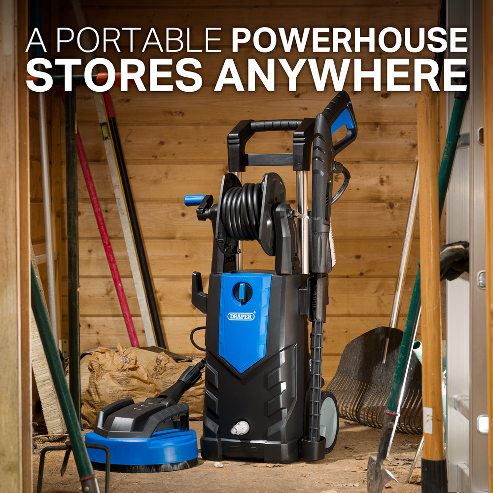 Make your outdoor space shine with the Draper 98678 Blue Pressure Washer 2100W. Powered by an induction motor, this pressure washer is perfect for trade use, cleaning patios, cars, caravans or worksites. The brushless motor means it is more efficient and requires less maintenance. It features a telescopic handle and large wheels, which make it easy to manoeuvre. The 6m high-pressure hose is conveniently stored on an integrated reel with a winding handle, making it tidier and safer when not in use. The total stop device is designed to save water, thus prolonging the life of the pump and the motor. Included in the kit is a patio cleaning attachment with a pivoting joint that facilitates use on both horizontal and vertical surfaces. Working pressure: 110 bar. Max pressure: 165 bar. Cable length: 5m. Weight: 18kg.