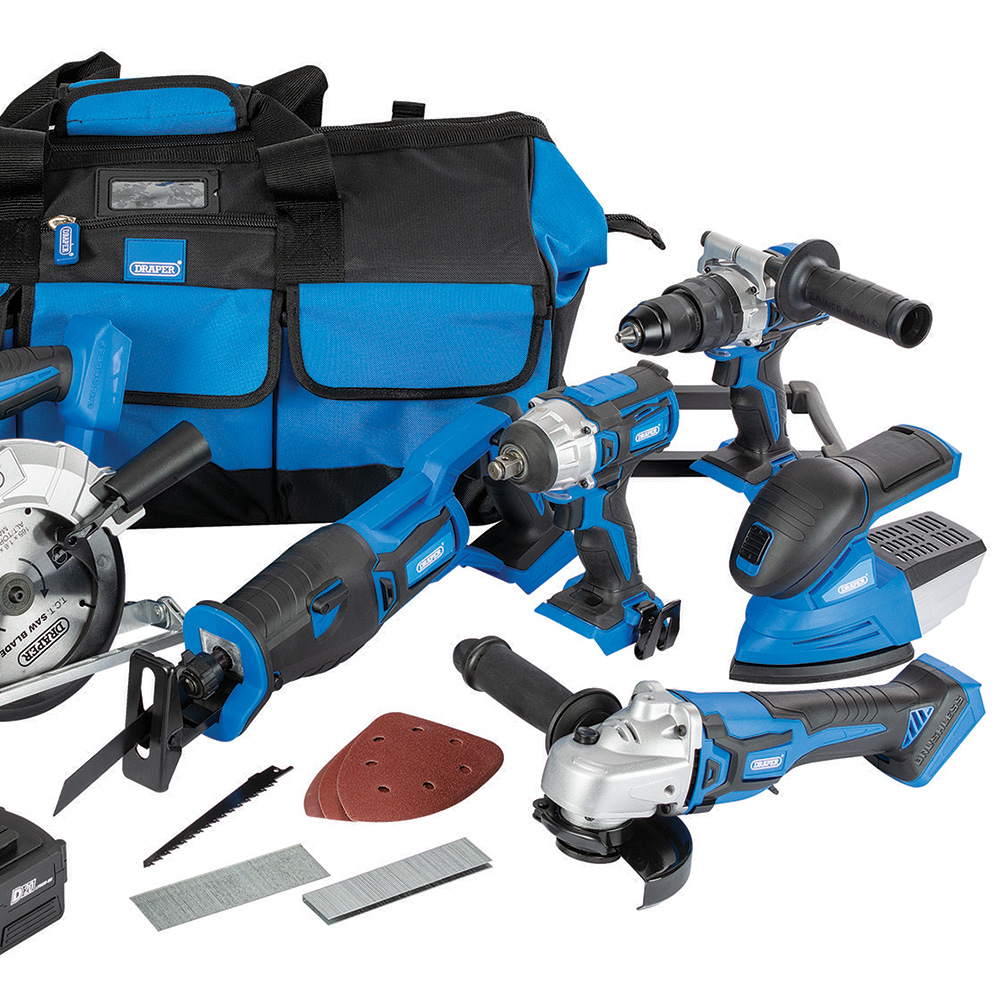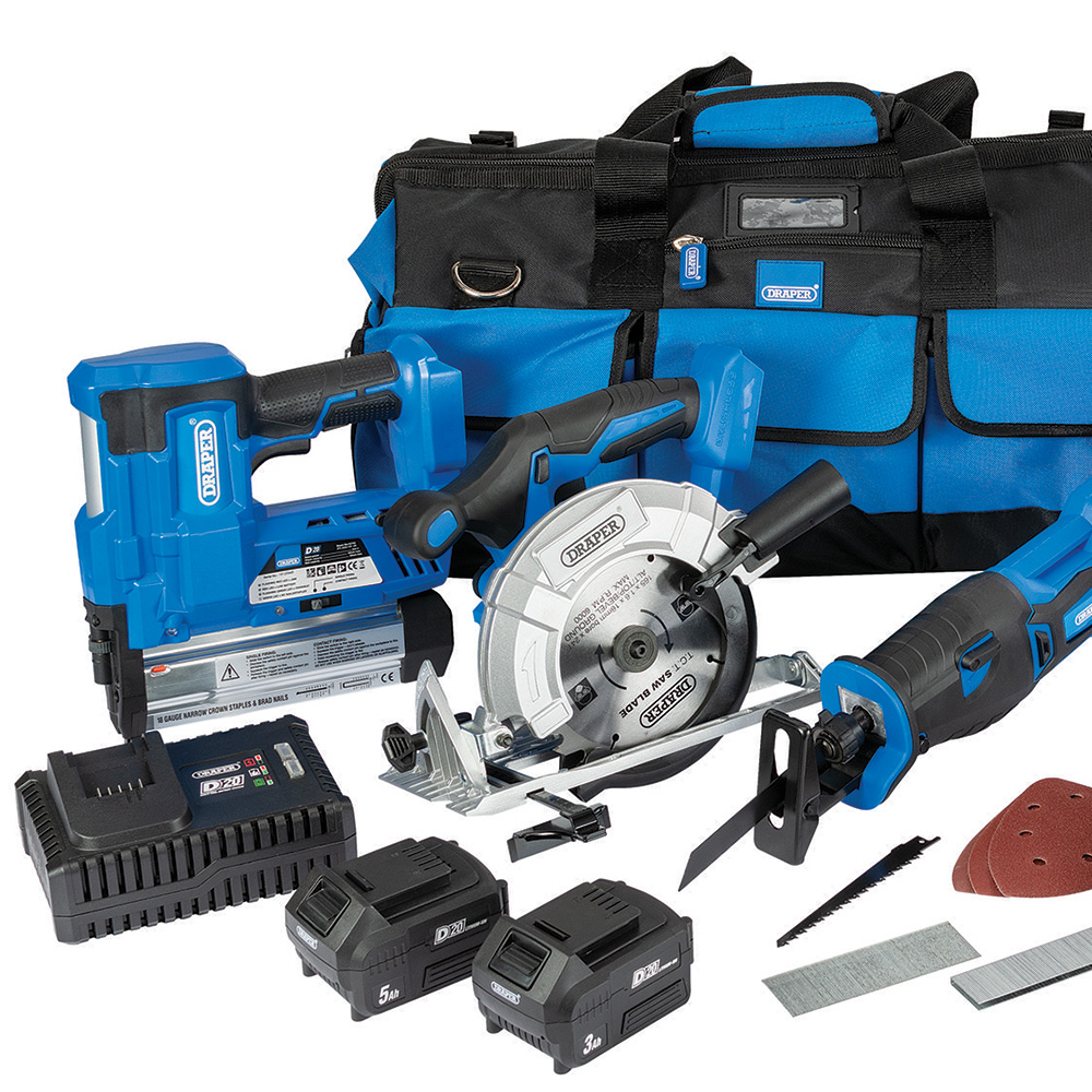 Update your tool kit with the Draper D20 20V Jumbo Kit. It is a comprehensive set of tools designed for various workshop tasks. The kit includes a brushless combi drill, brushless impact driver, brushless 115mm grinder, brushless circular saw, brushless reciprocating saw, tri-base sander, and nailer stapler. The kit also comes with a 3.0Ah battery, a 5.0Ah battery, and a fast charger. All of these tools and accessories are neatly stored in a 550mm hard bottom tool bag with wheels, making transportation and storage convenient. The D20 interchangeable battery system allows you to use one battery with any of the tools in the D20 series. This kit is perfect for professionals in various trades as well as experienced DIY enthusiasts.