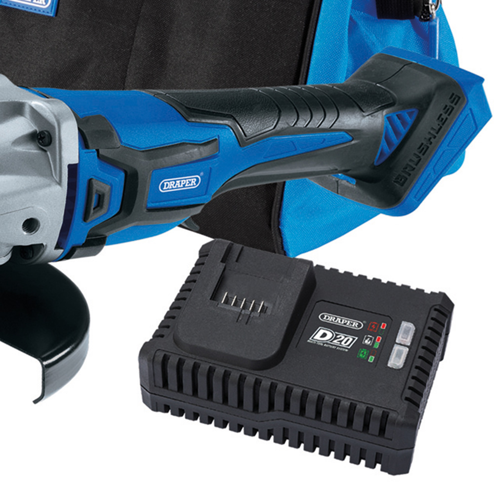 The Draper D20 Grinder 4.0 Kit is a component of the D20 series. It is equipped with a brushless motor, spindle lock, 3-position side handle, and M14 thread. The kit includes a D20 4.0AH battery, a D20 4A fast battery charger, and a heavy-duty medium 28L tool bag made from water-repellent polyester. This grinder is an essential part of the D20 series.