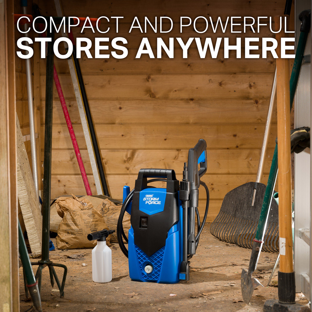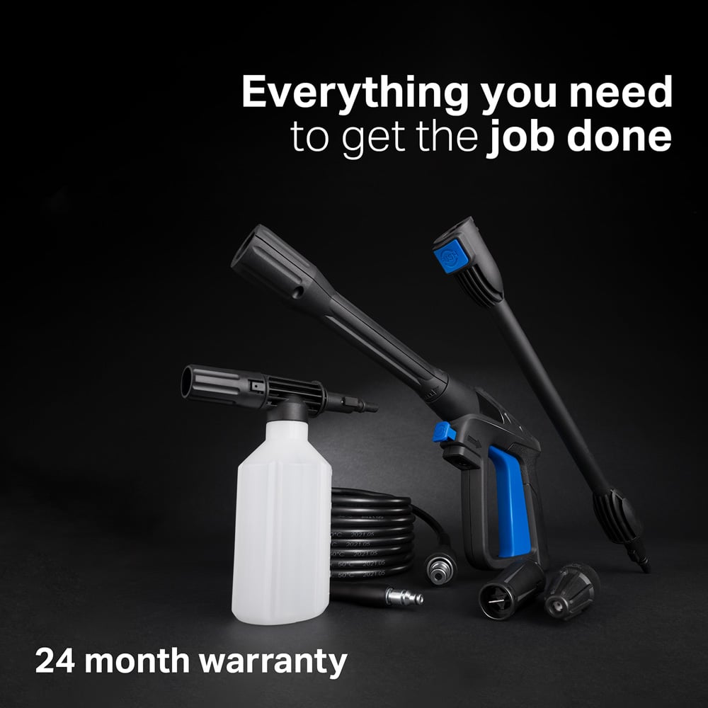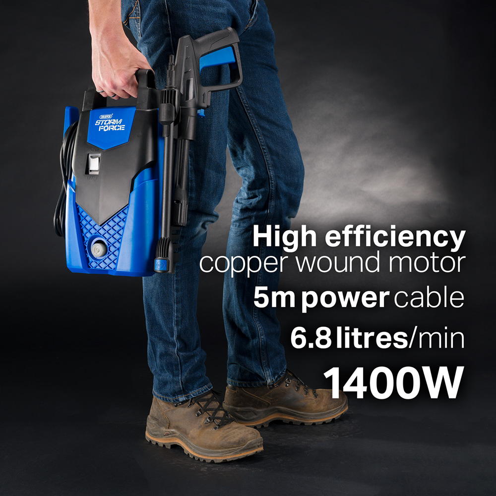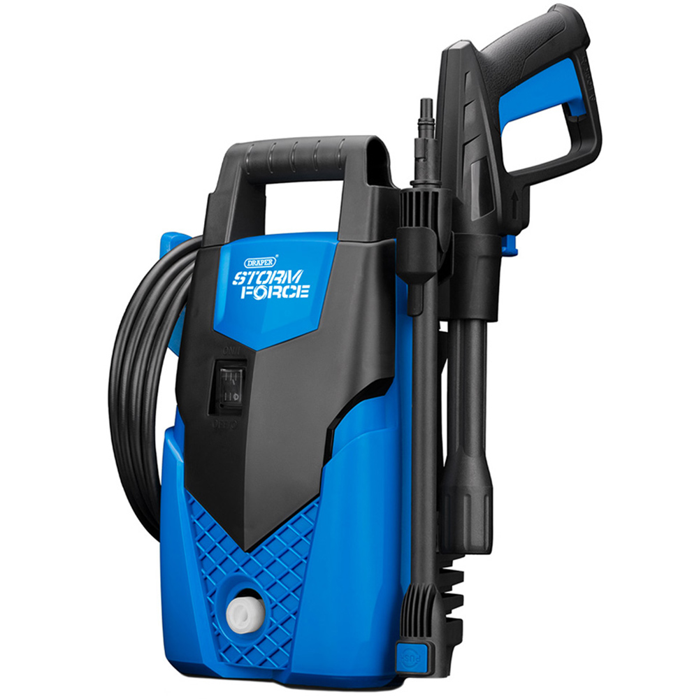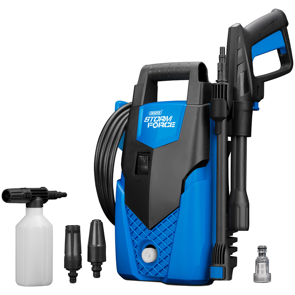 Blast away dirt with the Draper Pressure Washer 1400W. This lightweight pressure washer tackles grime and wash off dirt with ease. The easy-to-carry design and convenient handle make cleaning a breeze, while the total stop device saves water and extends the lifespan of the machine. Features: Wattage: 1400. Working pressure (+/- 10%): 1015psi (70bar). Max pressure (+/- 10%): 1523psi (105bar). Working flow (+/- 10%): 5.5l/min. Max flow (+/- 10%): 6.8l/min. Hose length: 3m. Cable length: 5m. Weight: 6.5kg.