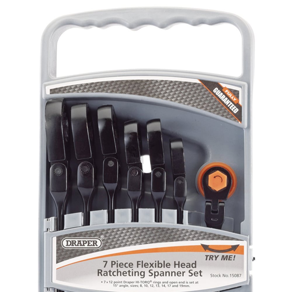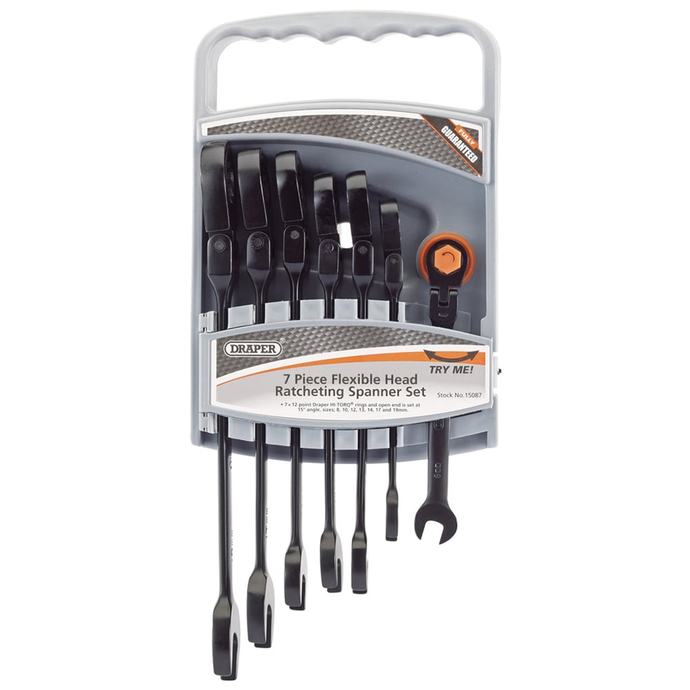 The Draper Ratcheting Comb Spanner Set suits a wide variety of jobs and purposes. The 7-piece metric spanner set is created with a Flexi-head that allows 180 degrees of movement. Open-end set at 15 degrees and only 5 degrees of movement is required to turn the fastener, especially useful in confined spaces. Manufactured from hardened and tempered chrome vanadium steel, with an electro-plated black finish - this spanner set is essential for your toolbox.