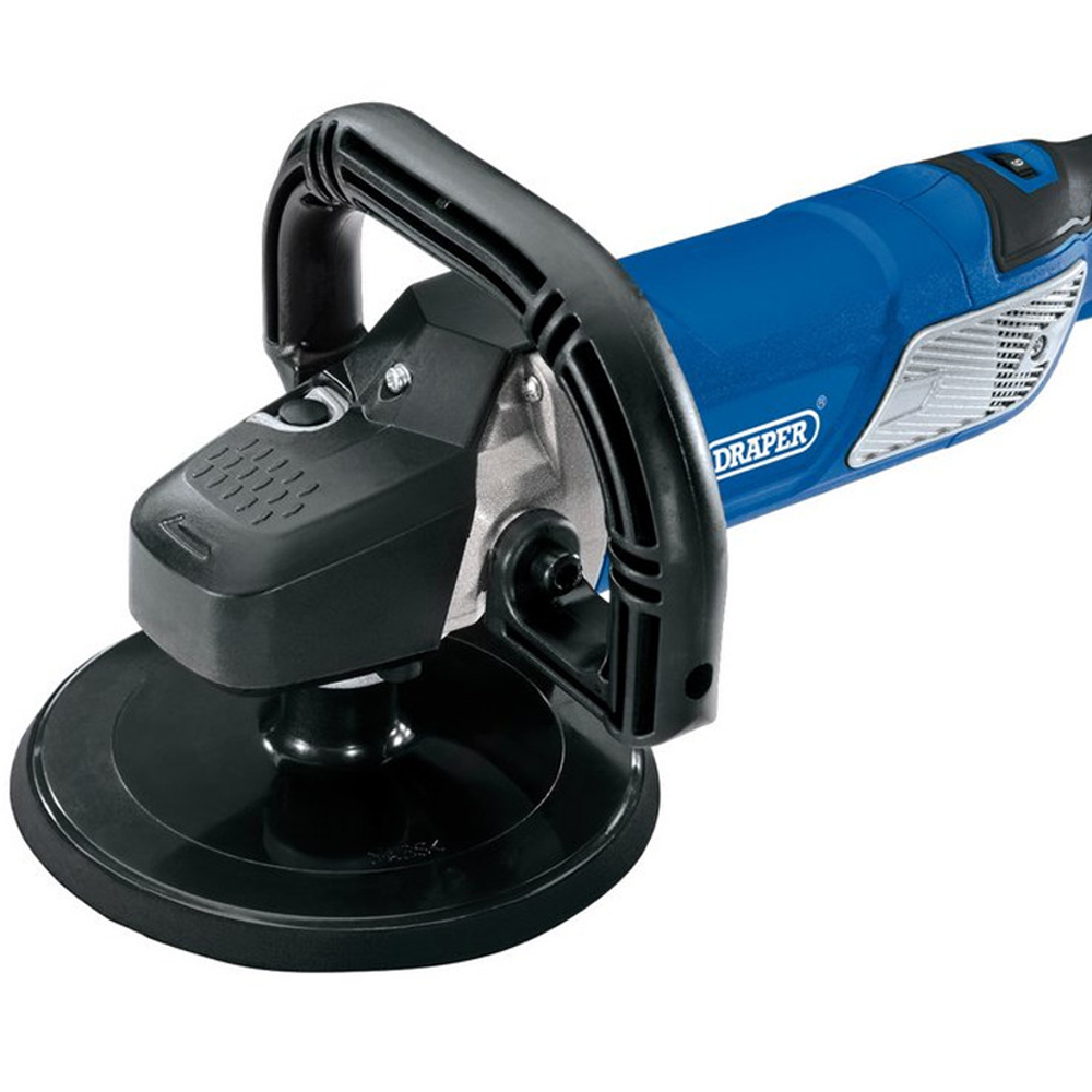 Draper 1200W Sander Polisher 180mm features dual function sander - polisher, constant electronics, hook and loop base, and a variable speed control. It is supplied with a polishing bonnet, hook and loop backing pad, sanding sheet, adjustable D handle with additional side handle and 3m cable with BS plug. Specifications: No Load Speed: 600-3000rpm, Pad Size: 180mm, Spindle Thread: M14. Voltage: 230V. Wattage: 1200W. Weight: 2.75kg.