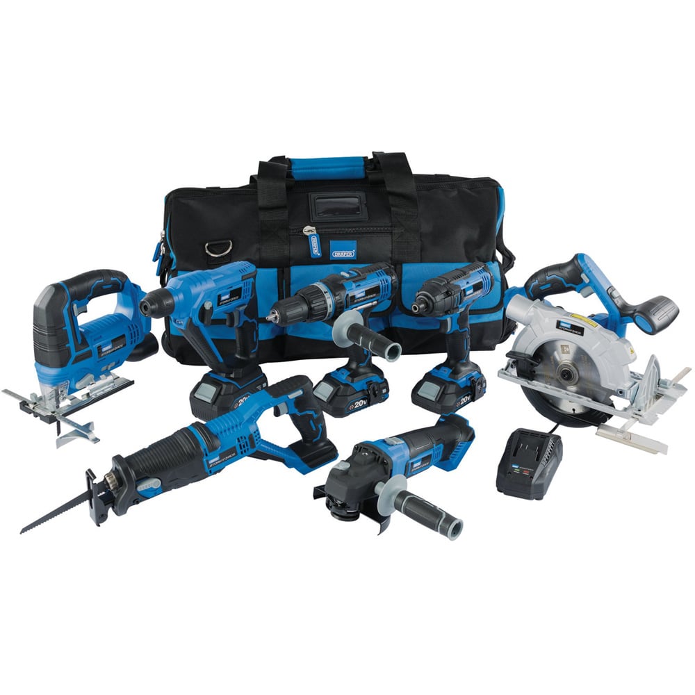 The Draper Machine Cordless Kit is ideal for a multitude of tasks. It is supplied with a 20V combi drill, 20V 1/4inch hex impact driver, 20V SDS+ rotary hammer drill, 20V 115mm angle grinder, 20V reciprocating saw, 20V circular saw, 20V orbital jigsaw, 2 x 2.0Ah Li-ion batteries, 1 x 4.0Ah Li-ion battery and charger. It is stored in a large, multi-pocket tool bag for easy transportation and storage. The kit contains 12 pieces.