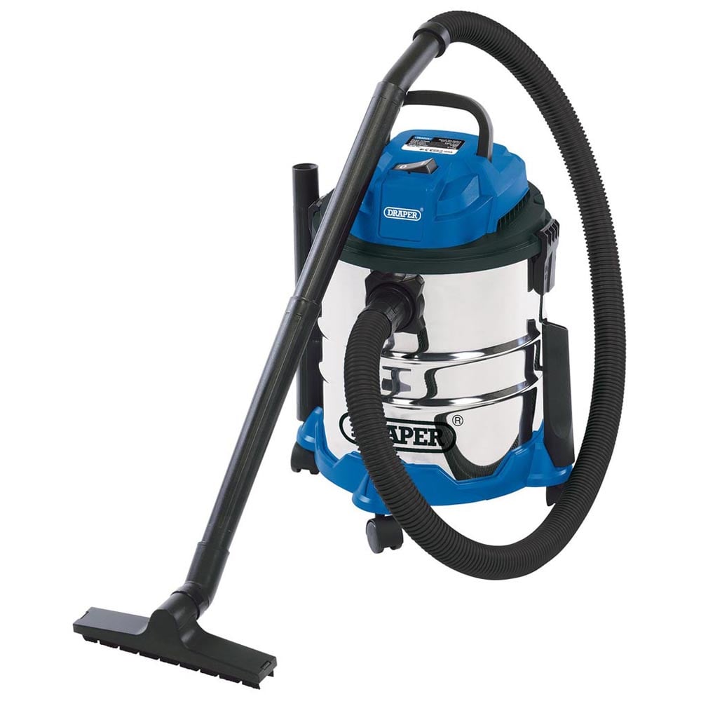 This robust Vacuum Cleaner from Draper comes with stainless steel tank and blower function. The vacuum cleaner is designed to pick up wet and dry materials with 20L tank volume. Ideally suited for use in the workshop, garage or DIY work around the home and garden. It comes with five metres long (approx.) cable and an approved plug. Come fitted with an onboard tool storage facility, castors for easy movability and a carry handle. Display carton. Includes: 3 x 345mm plastic tubes, 1 x 1.5m suction hose, 1 x foam filter, 1 x dual-action floor brush, 1 x cloth filter, 1 x crevice tool and 1 x dust bag.
