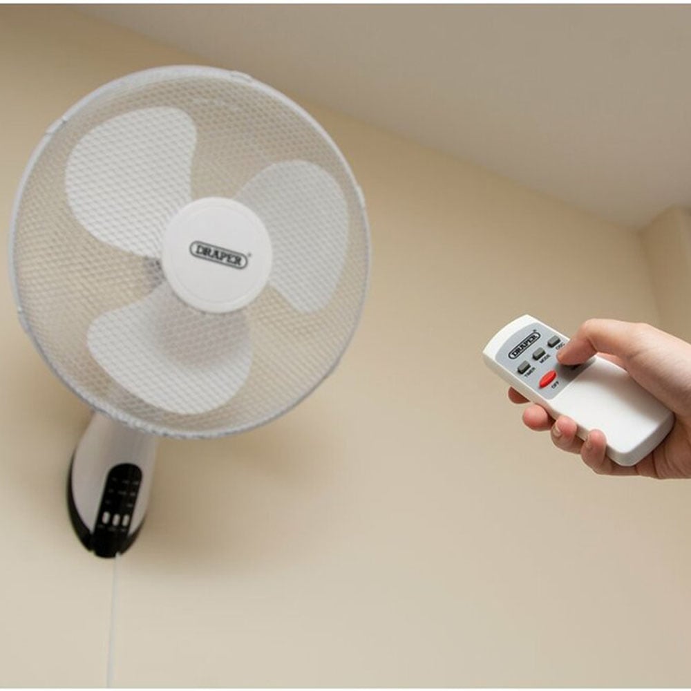 This remote-controlled 400mm oscillating wall-mounted fan from Draper is an ideal addition to any home or workplace. It has three-speed settings (low, medium and high) and oscillates to circulate the cooled air around the room, and it has an adjustable 90° tilt to further direct the airflow where it is most needed. There are three fan modes (normal, natural and sleep). In sleep mode, this fan can be set to turn off automatically using the built-in timer, which can be adjusted in 30-minute segments up to a maximum of 7.5 hours. The infra-red remote control enables the simple selection of the speed, fan mode and timer. Three-bladed design, for maximum efficiency, is protected by a metal safety guard. The wall-mounted design is a great space-saver when floor or desk space is limited. The remote control requires two AAA batteries - available separately.