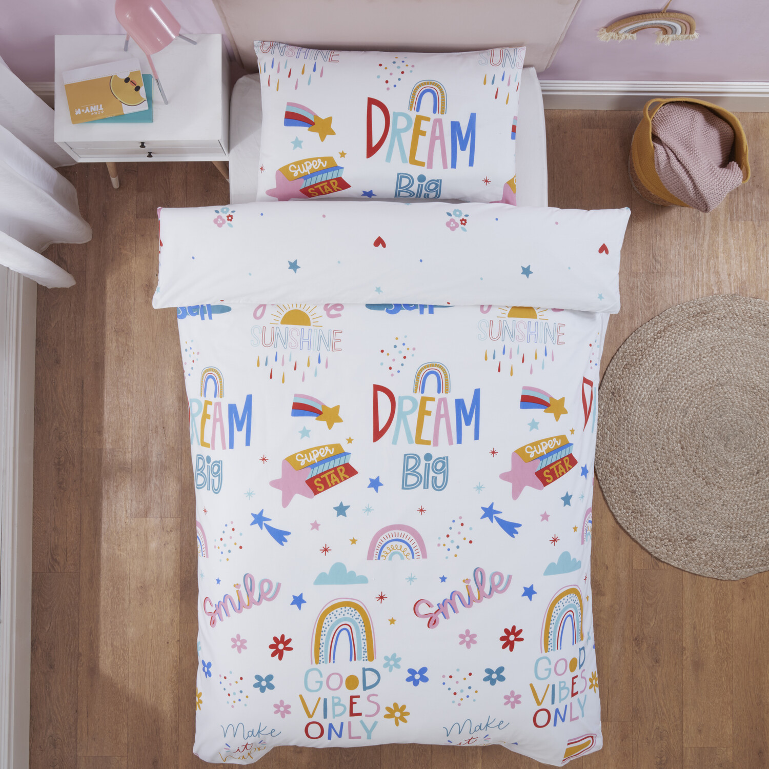 Bring good vibes to your child's bedroom with this Dream Big Single White Duvet Cover Set. Featuring vibrant colours and encouraging slogans, this bedding is sure to brighten up your child's room and bring a smile to their face. Soft and comfortable, this bedding is also reversible, providing two designs in one.
