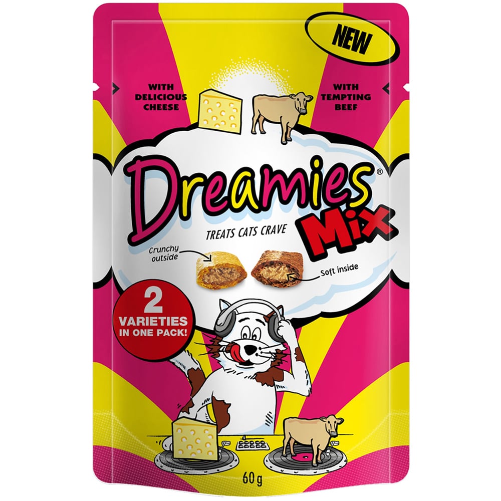 Give your cat something new to chew on with the tasty Dreamies Delicious Cheese and Tempting Beef Cat Treats. These treats include vital minerals and vitamins with only 2 kcal in each treat- making them a great way to reward your feline. Soft inside and crunchy outside, they make an irresistible treat for adult cats. Size: 60g. Ingredients: Cereals / Meat and Animal Derivatives (including 4% Beef in the Brown Kibble) / Oils and Fats / Minerals / Milk and Milk Derivatives (including 4% Cheese in the Yellow Kibble) / Derivatives of Vegetable origin. Feeding instructions: Feed as a treat or reward as part of a balanced diet. Cats should be supervised at all times whilst feeding and always provide plenty of fresh water for your pet. Treats should always be given on a non-stainable surface as some products may stain.