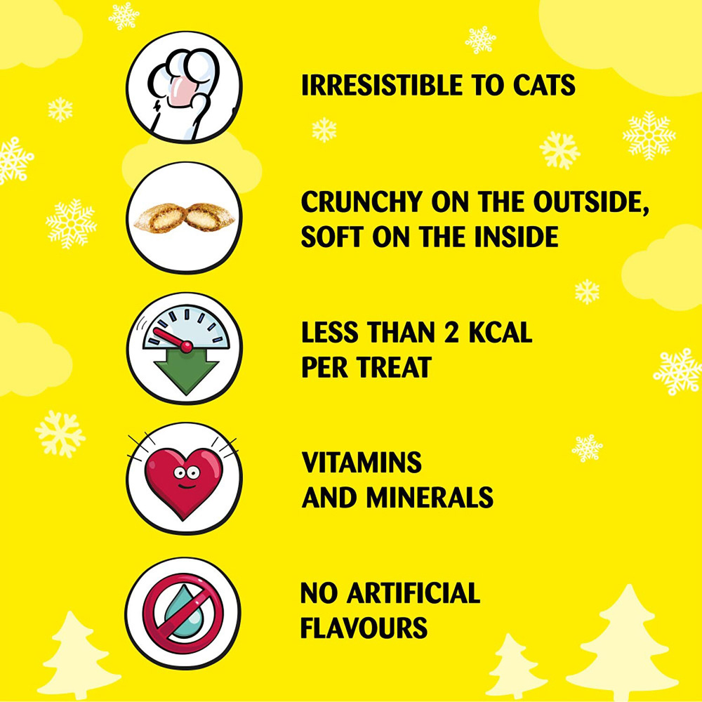 Give your cat something new to chew on with this tasty Dreamies Adult Cat Treats Christmas Gift Box. This collection offers 11 packs of treats with chicken, beef and cheese as well as catnip and salmon flavours - offering a selection of great recipes to reward your cat. These treats include vital minerals and vitamins with only 2 kcal in each treat- making them a great way to reward your feline. Soft inside and crunchy outside, they make an irresistible treat for adult cats. Size: 315g. Includes: 3 x Dreamies Adult Cat with Chicken 30g, 3 x Dreamies Adult Cat with Cheese 30g, 2 x Dreamies Adult Cat with Beef 30g, 2 x Dreamies Adult Cat with Salmon Flavour 30g, 1 x Dreamies Adult Cat with Salmon Flavour 15g. Feeding instructions: 1+ Year - 20 treats per day. Age 2 to 12 months - 6 treats per day. Ingredients: With Chicken: Cereals, derivatives of vegetable origin, meat and animal derivatives (including chicken 4%), oils and fats, vegetable protein extracts, minerals. With Salmon Flavour: Cereals, derivatives of vegetable origin, meat and animal derivatives, oils and fats, vegetable protein extract minerals. With Cheese: Cereals, oils and fats, derivatives of vegetable origin, meat and animal derivatives, minerals, vegetable protein extracts, milk and milk derivatives (including dried cheese powder 2.2%, equivalent to cheese 4%). With Beef: Cereals, derivatives of vegetable origin, oils and fats, meat and animal derivatives (including beef 49), minerals, vegetable protein extracts. With Catnip Flavour: Cereals, derivatives of vegetable origin, meat and animal derivatives, oils and fats, vegetable protein extracts, minerals. Analytical Constituents (%): Protein 22, Fat content 22, Inorganic matter 9, Crude fibre 2, Energy 408kcal/100g.