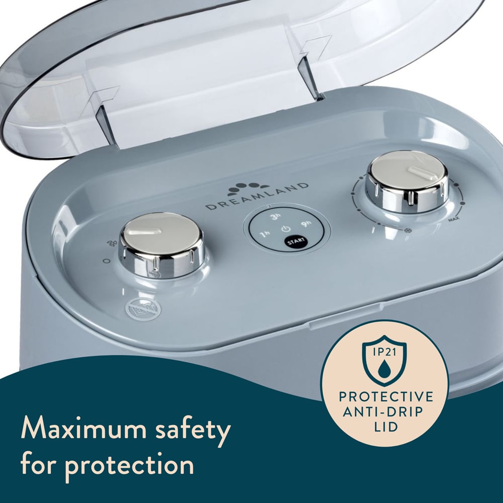 Experience the next level of warmth with this Dreamland Silent Power Portable Protection Fan Heater. It's designed to provide cosy comfort even in humid environments. This fan heater features a programmable timer for automatic switch-off with three pre-set options: one hour, three hours, and nine hours, so you can enjoy peace of mind. The four versatile functions: warm air, hot air, rapid heating, and cool air, allow you to tailor the warmth to your preferences. With this portable fan heater, you can bring unmatched warmth and safety into your space wherever you desire.