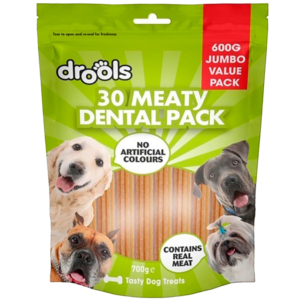 The Drools Jumbo Meaty Dental Pack is a tasty snack for your dog. They can be used as a treat or part of a balanced diet and contains real meat and no artificial colours. The snacks also help to keep your dog's teeth clean and gums healthy.