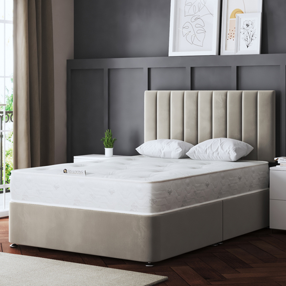 Give your room a makeover with the DS Living Amelia Single Beige Upholstered Panel Divan Bed with 2 Drawer. This bed features spacious storage with two drawers, making it perfect for maximising your bedroom space. The headboard, in a rich beige colour, adds a touch of luxury with its deep-padded panels that beautifully reflect natural light. Built with durability in mind, this bed comes with a 24-inch headboard. This headboard is securely fitted to the base with sturdy wooden struts for extra support. Crafted from a solid hardwood mix, this bed is made to last, giving you a blend of quality and timeless style. Please note that the mattress is sold separately. This bed is handcrafted, so slight variations in dimensions may occur. It is recommended that you check the stairs and room space before making a purchase. Size: 100 x 210cm.