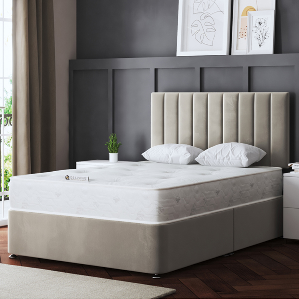 Give your room a makeover with the DS Living Amelia Super King Size Beige Upholstered Panel Divan Bed with 4 Drawer. This bed features spacious storage with four drawers, making it perfect for maximising your bedroom space. The headboard, in a rich beige colour, adds a touch of luxury with its deep-padded panels that beautifully reflect natural light. Built with durability in mind, this bed comes with a 24-inch headboard. This headboard is securely fitted to the base with sturdy wooden struts for extra support. Crafted from a solid hardwood mix, this bed is made to last, giving you a blend of quality and timeless style. Please note that the mattress is sold separately. This bed is handcrafted, so slight variations in dimensions may occur. It is recommended that you check the stairs and room space before making a purchase. Size: 190 x 220cm.