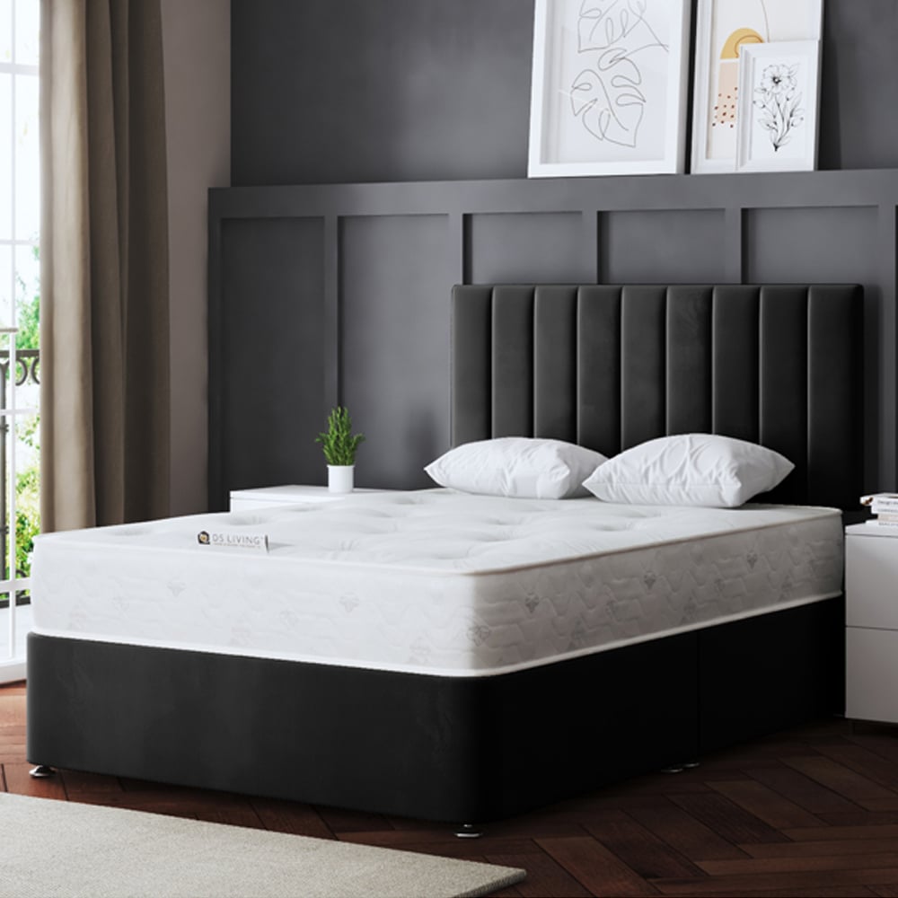 Sleep beautifully and wake up refreshed with the DS Living Amelia Super King Size Black Upholstered Panel Divan Bed with 4 Drawer. This bed features spacious storage with four drawers, making it perfect for maximising your bedroom space. The headboard, in a rich black colour, adds a touch of luxury with its deep-padded panels that beautifully reflect natural light. Built with durability in mind, this bed comes with a 24-inch headboard. This headboard is securely fitted to the base with sturdy wooden struts for extra support. Crafted from a solid hardwood mix, this bed is made to last, giving you a blend of quality and timeless style. Please note that the mattress is sold separately. This bed is handcrafted, so slight variations in dimensions may occur. It is recommended that you check the stairs and room space before making a purchase. Size: 190 x 220cm.
