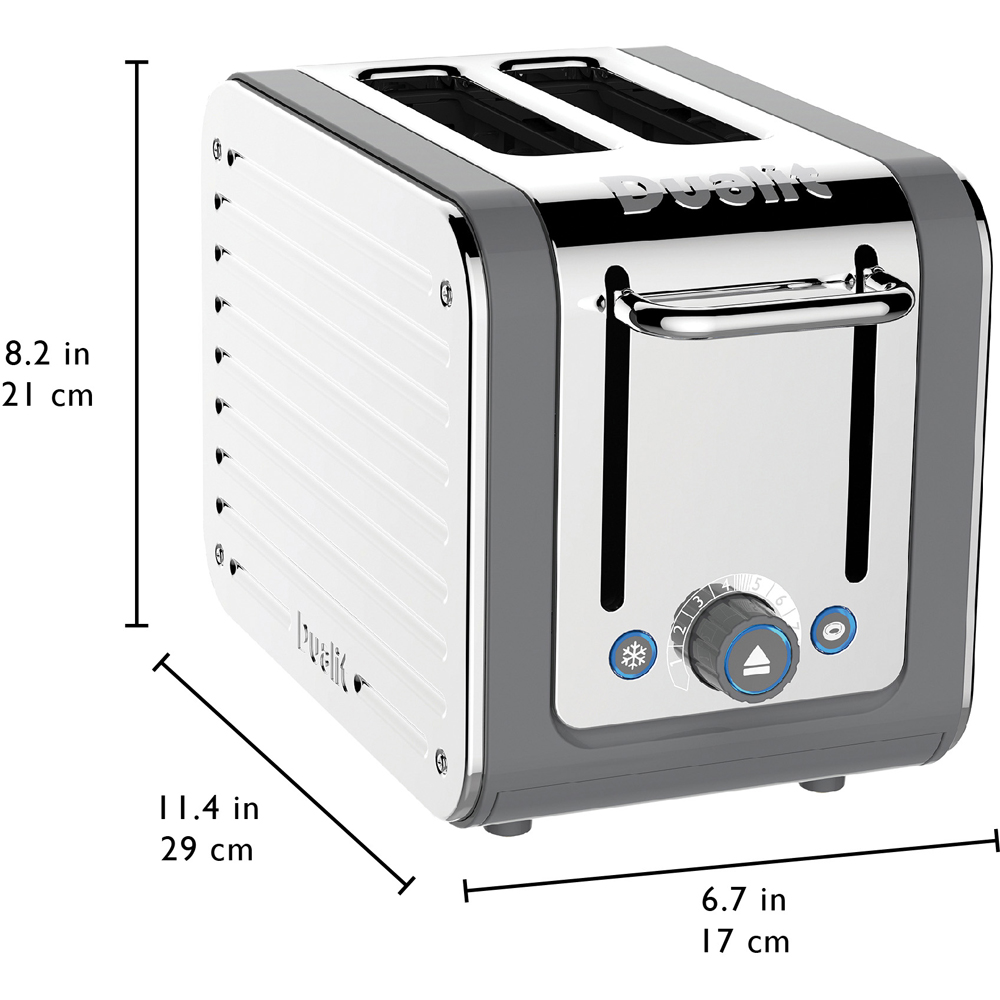 Dualit's 2 Slot Architect Toaster in grey seamlessly combines modern design with practical functionality. Featuring patented technology, it is equipped with extra-wide 36mm slots, accommodating a variety of bread sizes and types. The bagel setting ensures perfect results by toasting one side while gently warming the other, and the defrost function allows you to toast bread directly from the freezer. The toaster also includes variable browning control for tailored toasting, frozen, cancel, and reheat functions for versatility, and a high lift function for safe and easy removal of smaller items. The removable crumb tray keeps maintenance simple, ensuring your countertop stays tidy.