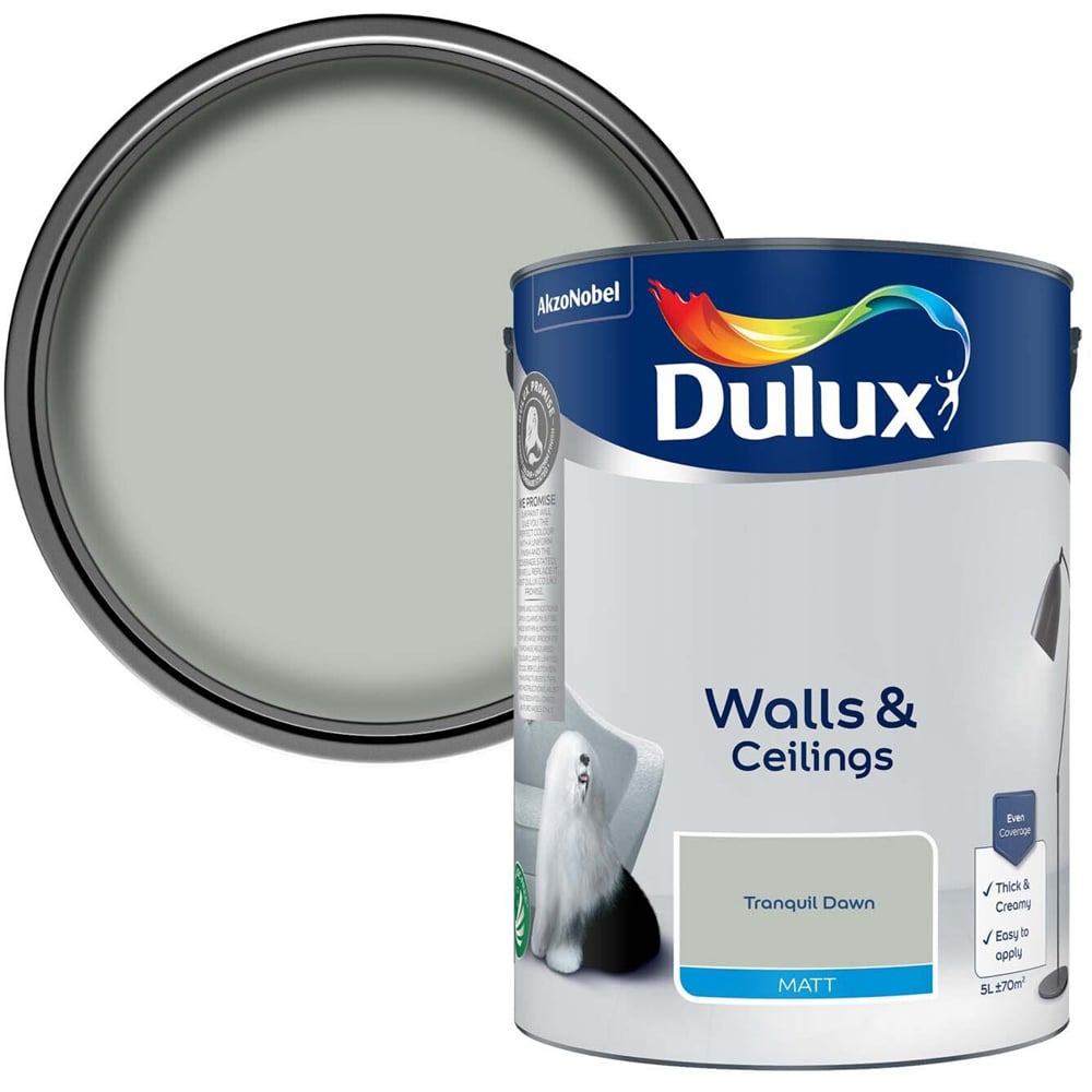 Dulux Tranquil Dawn Matt Emulsion Paint 2.5L is smooth and creamy and suitable for use on interior walls and ceilings. Itand#39;ll leave your walls with a modern, flat finish. Coverage is 16 square metres per liter.