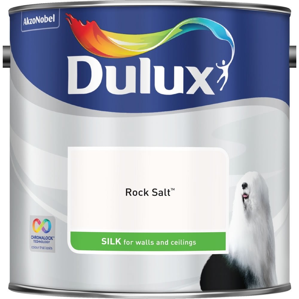 Dulux Silk Rock Salt paint 2.5 liters is a smooth and creamy emulsion paint for use on walls and ceilings which is ideal for a delicate shine finish. Chromalock is a technology exclusive to Dulux that creates an invisible protective barrier around the colour on your walls, protecting from the wear and tear of everyday life, bringing you colour that lasts. Coverage is 13 square metre per liter. Leave 2-4 hours to dry between coats.