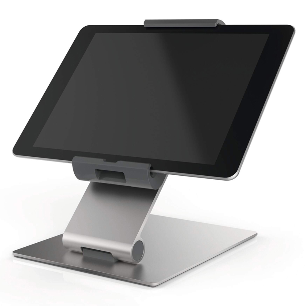 Find your perfect viewing angle with the Durable Aluminium Desk Stand Foldable Tablet Holder. Introducing a sleek and contemporary silver tabletop holder for tablets that can be used in any setting. This holder is ideal for a wide range of tablets, from 7 to 13 inches, and comes with an anti-theft system that ensures that your tablet remains secure and protected. The holder's clamp mechanism is designed to hold the tablet firmly in place and can be rotated 360°, making it easy to switch between portrait and landscape modes. With an impressive tilt angle range of 0° to 88°, this holder offers complete flexibility for optimal viewing. It's perfect for use in various settings, such as hotels, exhibitions, trade fairs, restaurants, offices, and even at home. Dimensions: 242 x 155 x 183mm.
