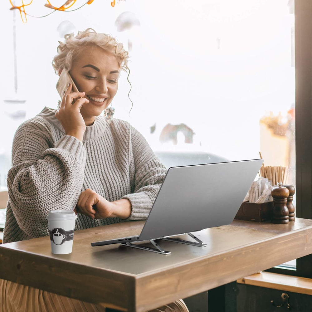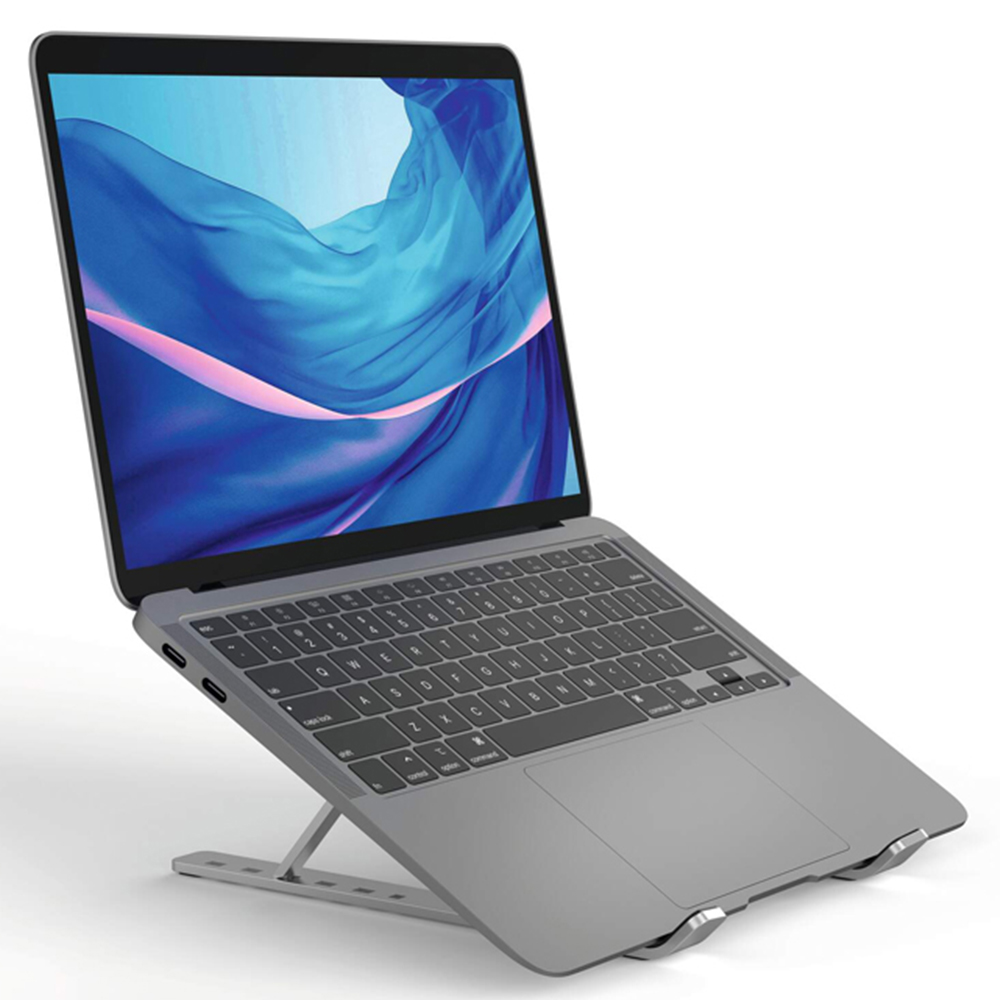 Bring this practical addition, the Durable Aluminium Foldable Contemporary and Portable Laptop Stand Rise, into your working place. The stand is foldable and portable for mobile devices such as laptops and can hold up to 5 kg. The stand is recommended for mobile devices in sizes from 10 to 15 inches. It helps facilitate ergonomic work with flexible height and reading angle settings, with six different heights available. The rubber pads on the base protect the device from scratches. Perfect for use with laptops and tablets in the office, home office, daily commute, etc.