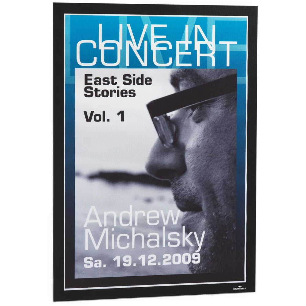 Present posters and advertising professionally Durable Duraframe A3 Black Self Adhesive Magnetic Signage Frame 6 Pack. The frame comes in a sleek black colour and features a unique magnetic fold-back design to make exchanging inserts quick. When applied to a glass surface, you can display information on both sides without leaving behind any residual after removal. Save your indoor walls from permanent signage frame installation damage by putting up this magnetic frame on any metal surface and displaying information with ease.