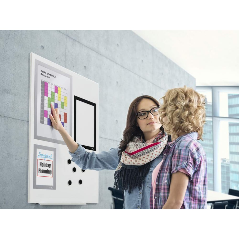 Display documents and notices on metal surfaces easily with this Durable Duraframe A3 Silver Magnetic Document Signage Frame 5 Pack. The frame's inserts can quickly be exchanged by simply lifting the magnetic frame away from the surface. This A3 frame comes in a sleek silver colour and can be used on metal surfaces in both portrait as well as landscape formats so you can customise it the way you need. It's perfect for displaying important information in warehouses and production areas or on whiteboards in the office.