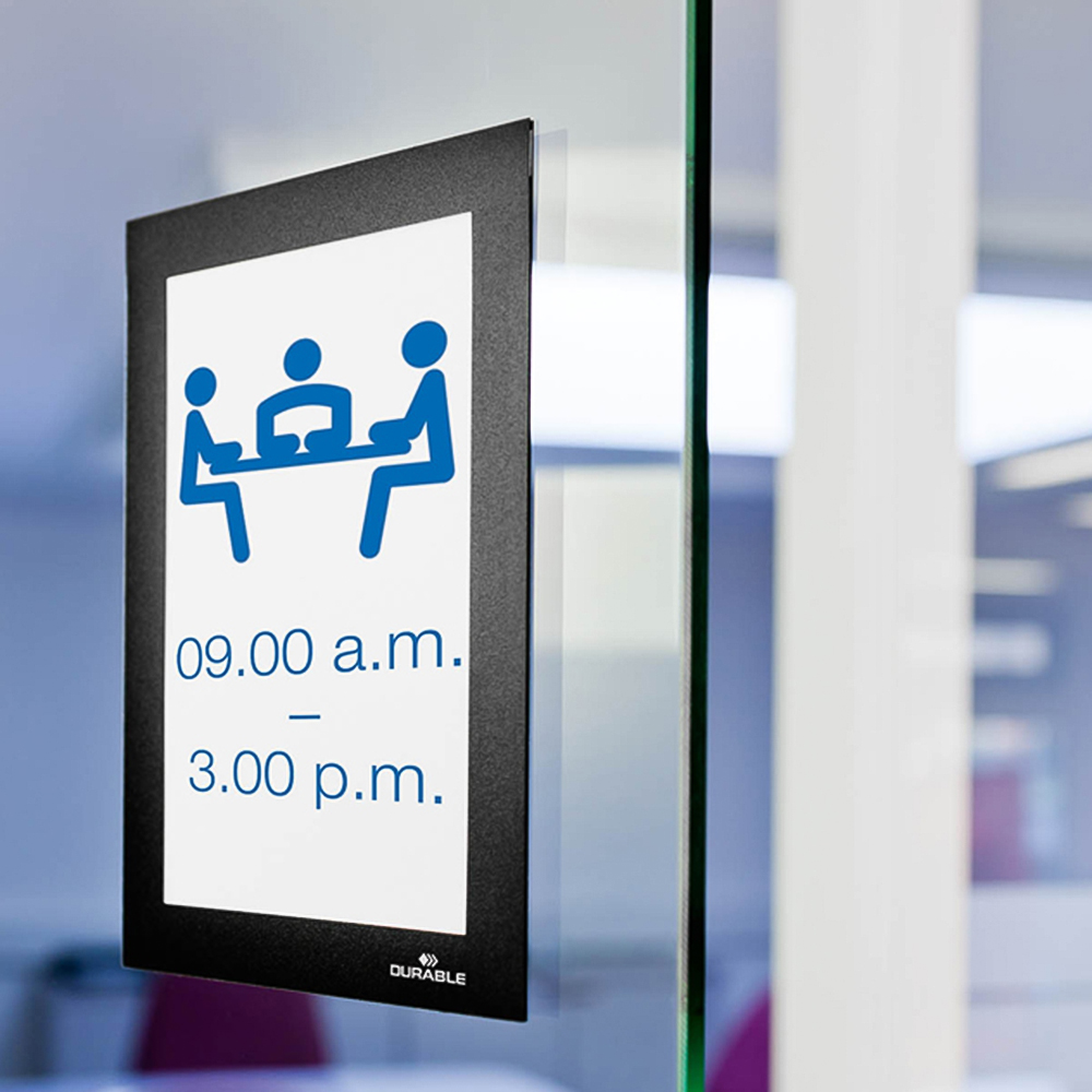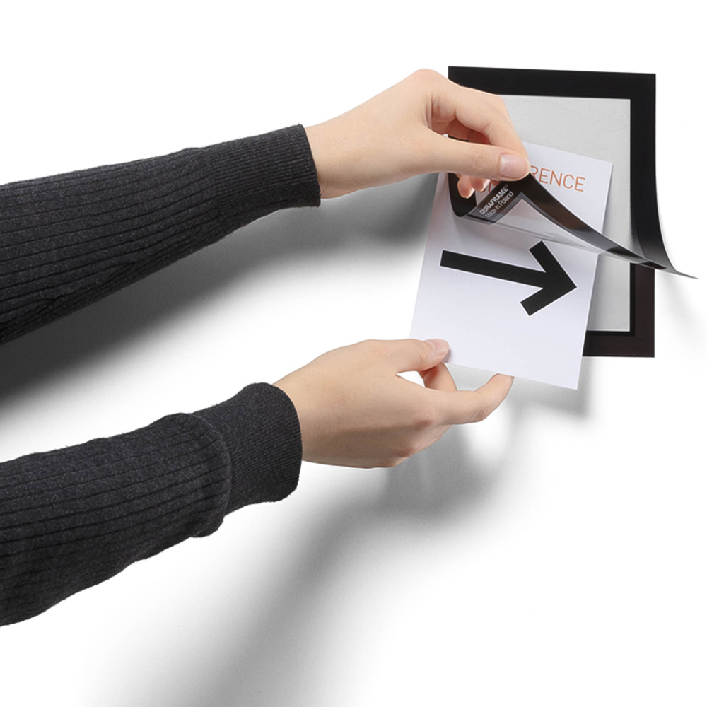The ultimate solution for displaying documents and notices with style and ease. Effortlessly swap inserts by simply lifting the magnetic frame, making updates quick and seamless. Designed in Germany and crafted in Europe, DURAFRAME is the UK's top choice for a reason. Perfect for showcasing essential information such as notices, promotions, timetables, and health & safety guidelines in either portrait or landscape format. This versatile solution is popular in Retail, Offices, Education, Healthcare, Warehouses and Production Facilities alike. It features boldly coloured frames with discreet magnetic strips for a clean, sleek look. The frame's window ensures the entire document is easily readable. The self-adhesive backing can be applied to any surface and be removed with no residue. UV Protection and an identically coloured frame on both sides give you a double-sided signage solution. Made from premium, durable materials that protect your documents from wear and tear. Wider magnetic strips on all sides keep documents securely in place. Magnetic seal on all sides helps guard against damage from dust, liquid, and daily use. Anti-glare, scratch-resistant coating ensures documents remain easy to read and protected over time.