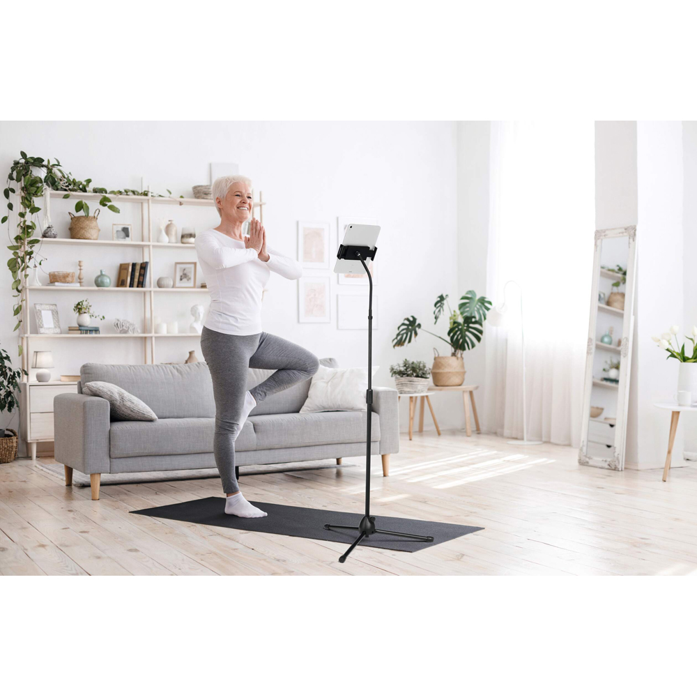 Find your perfect viewing angle with the Durable TWIST Black Gooseneck Tripod Stand Tablet and Phone Holder. Crafted from 100% recyclable materials and presented in sustainable, plastic-free packaging to help you minimize your environmental footprint. The holder is the ultimate accessory with a flexible gooseneck and 360-degree ball joint to achieve the perfect viewing angle for video calls and media consumption. Non-slip pads protect your device from scratches, and the unique tripod base provides great stability. The telescopic tripod can be adjusted to any height up to 1.72m and can be folded down to 70cm. Includes free carrying bag. For screen sizes: 4.7 to 13 inches. Dimensions: 172 x 55 x 55cm.