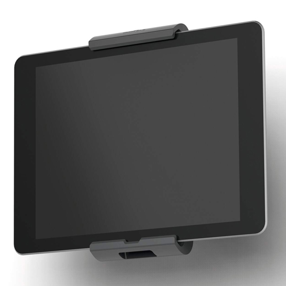 Find your perfect viewing angle with the Durable Universal Aluminium Wall Mount Tablet Holder. A modern and stylish wall-mounted tablet holder in silver, which is perfect for any environment. The tablet holder securely holds tablets from 7 to 13 inches and includes an anti-theft system to prevent unauthorised removal of the tablet. The clamp securely holds the tablet in place and is rotatable 360° for use in both portrait and landscape formats. The wall-mounted tablet holder is easy to assemble and securely attaches to walls via the included screw kit or included self-adhesive pad. Perfect for use in hotels, exhibitions, trade fairs, restaurants, at home, offices, etc. Dimensions: 50 x 85 x 180mm.