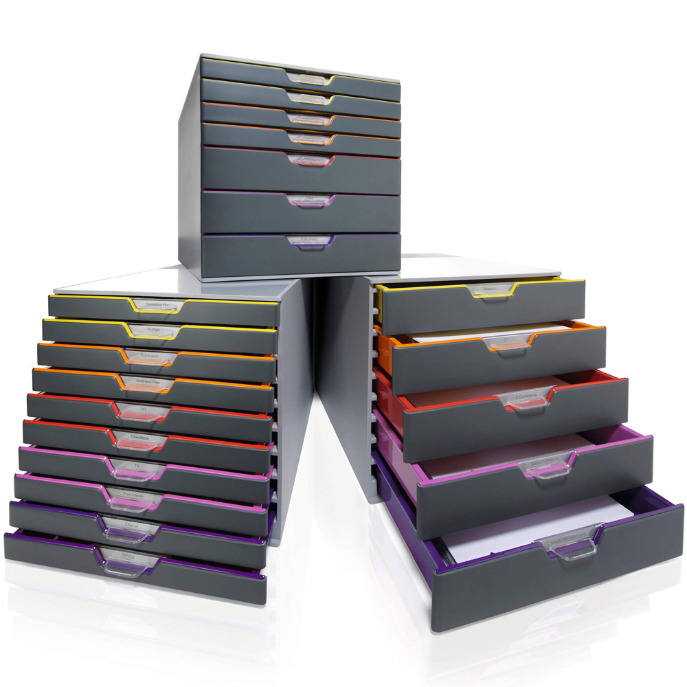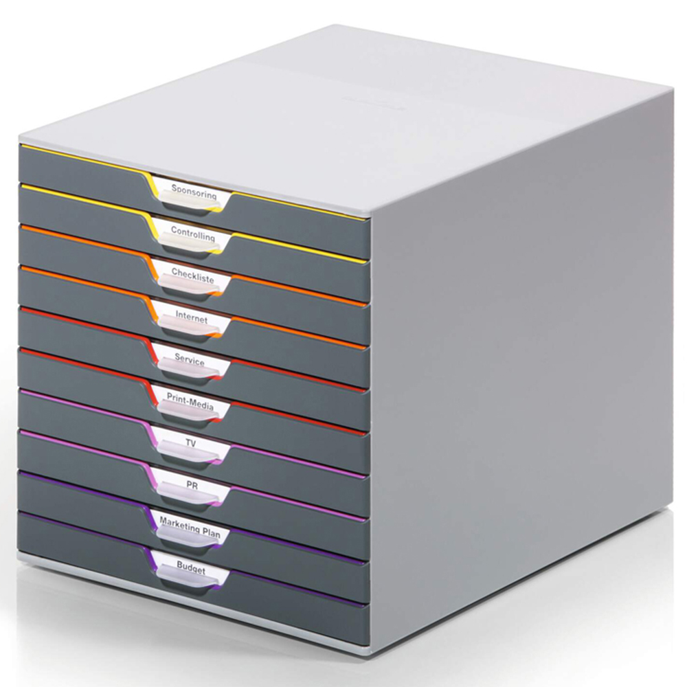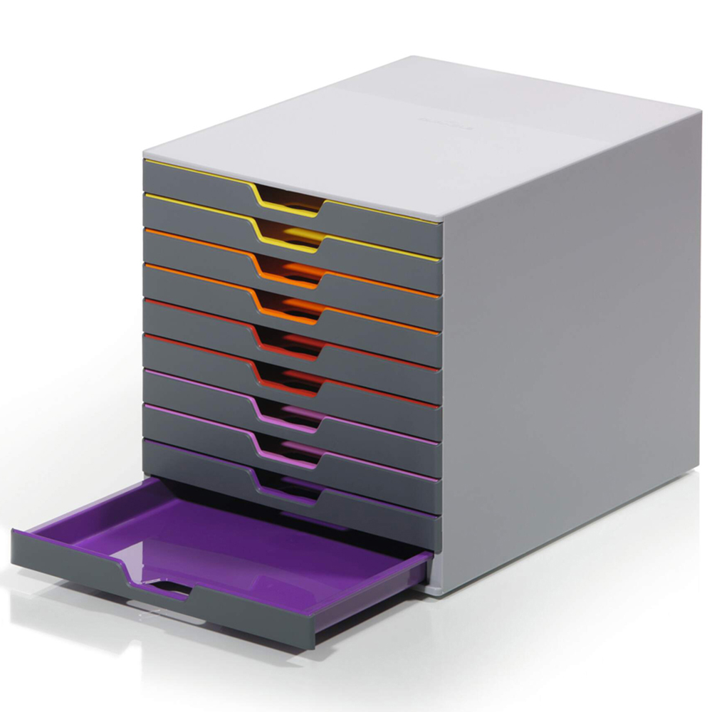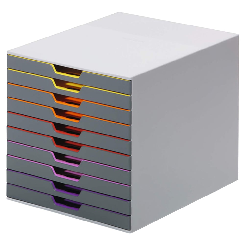 Stay organised in style with the Durable VARICOLOR A4+ 10 Drawer Colour Coded Desk Organiser. The drawer box is made of premium-quality plastics with ten silent smooth-operating drawers. Say goodbye to large filing cabinets and enhance your organisation with colour-coloured drawers, giving you more space to stay organised. The unit includes transparent labelling windows and easily exchangeable printable inserts with digital templates for easy organisation. The drawers are stackable and feature anti-slip plastic feet for stability and the protection of your desk. Includes: 1 x Varicolor draw box, 10 x clear labelling windows, and 10 x printable labelling inserts. Paper sizes: A4, C4, folio and letter size formats. Size: 292 x 280 x 356mm.