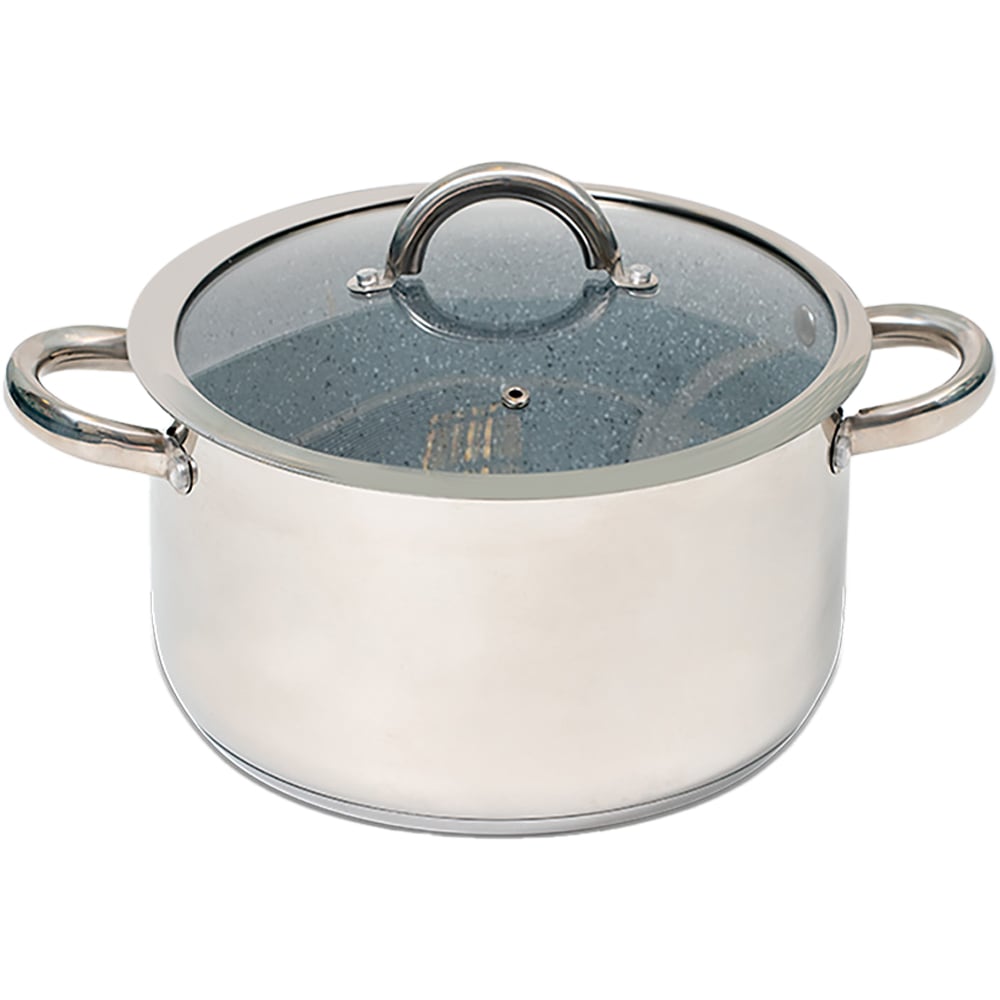 Unlock culinary possibilities with the Durastone 24cm Non Stick Deep Stainless Steel Casserole Pan with Lid. Perfect for soups and pasta or simmering large joints, this stock pot combines durable polished stainless steel with the hard-wearing, nonstick properties of a PFOA-free coating. This allows you to cook with little or no fat, oil or butter for healthier eating. Plus, the conductive properties of the sandwich base make for faster, more efficient, energy-saving cooking. The stockpot is 24cm in diameter and 14cm deep, holding up to 5.5 litres. Dishwasher safe and suitable for all hob types, including induction. It has a vented shatter-resistant glass lid, including stainless steel rims and handles. It is also oven-safe up to 260 degrees, so can be used on the hotplate or in the oven and food served straight to the table.