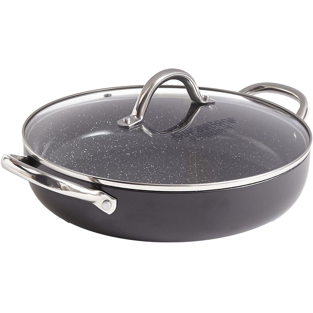 Unlock culinary possibilities with the Durastone 28cm Non Stick Shallow Aluminium Casserole Pan with Lid, the perfect solution for one-pot cooking. This heavy-duty aluminium pan features a hard-wearing, nonstick, PFOA-free ceramic stone interior coating. This allows you to cook with little or no fat, oil or butter for healthier eating. The family pan is 28cm in diameter and extra deep at 6.5cm, allowing it to be used in the oven as a shallow casserole as well as on the hob. It is perfect for stir-fries, curries, risotto and chillies. The pan has a toughened glass lid with a steam vent and stainless steel rim and handles. Dishwasher safe and suitable for all hob types, including induction, making it ideal for serving your dishes straight to the table.